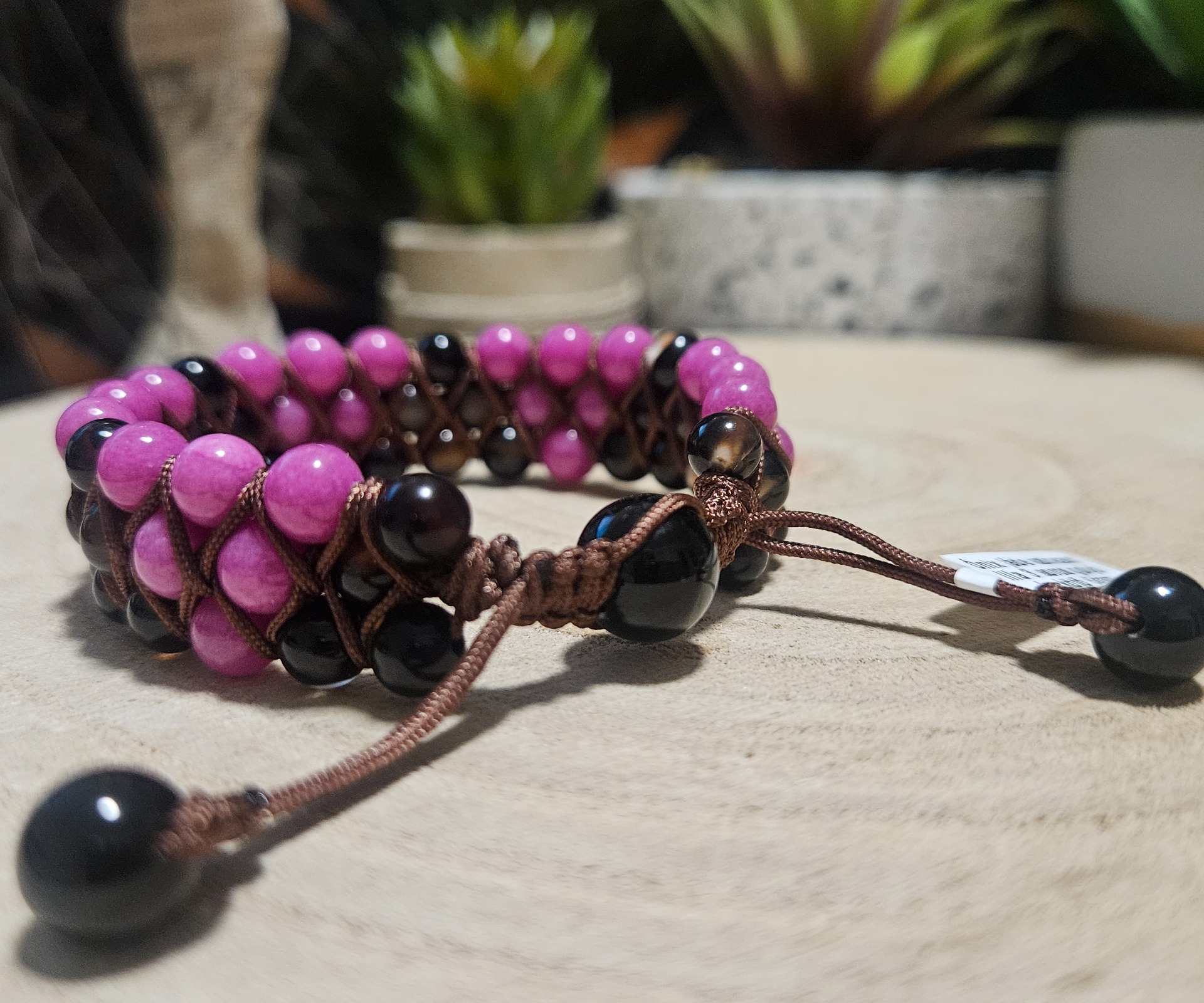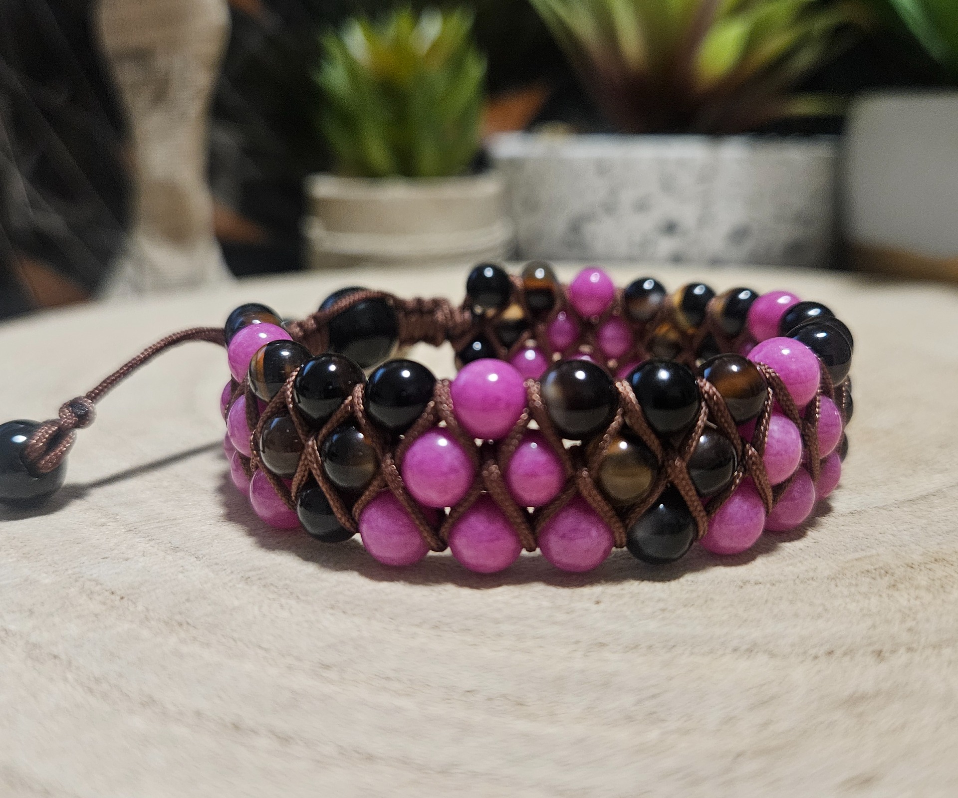 Objavte dokonalú rovnováhu medzi ochranou a energiou s týmto impozantným trojradovým shamballa náramkom. Kombinácia výrazného lila jadeitu a elegantného čierneho onyxu vytvára šperk, ktorý je nielen štýlovým doplnkom, ale aj silným osobným talizmanom. Vďaka precíznemu uzlovému viazaniu a nastaviteľnej veľkosti dokonale sedí na každom zápästí a prináša pocit stability.