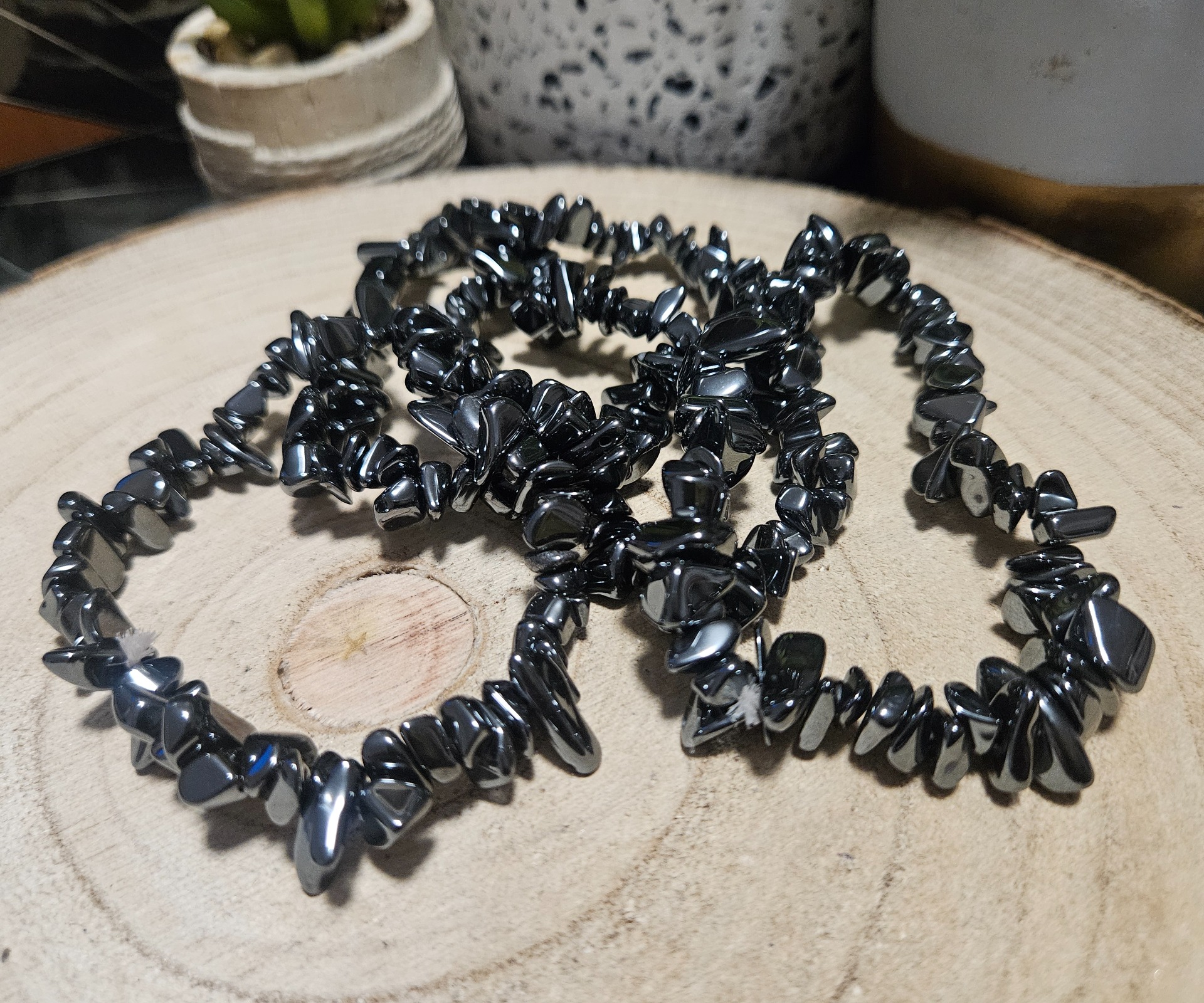 Ez a Hematit splitter karkötő egyedi és modern megközelítést kínál a klasszikus védőásványhoz. A karkötő nem szabályos gömbgyöngyökből, hanem apró, polírozott, szabálytalan alakú Hematit darabokból (splitterekből) áll]. Minden egyes szilánk fémfényű, acélszürke felülete ragyog, ami dinamikus és texturált megjelenést kölcsönöz a karkötőnek.