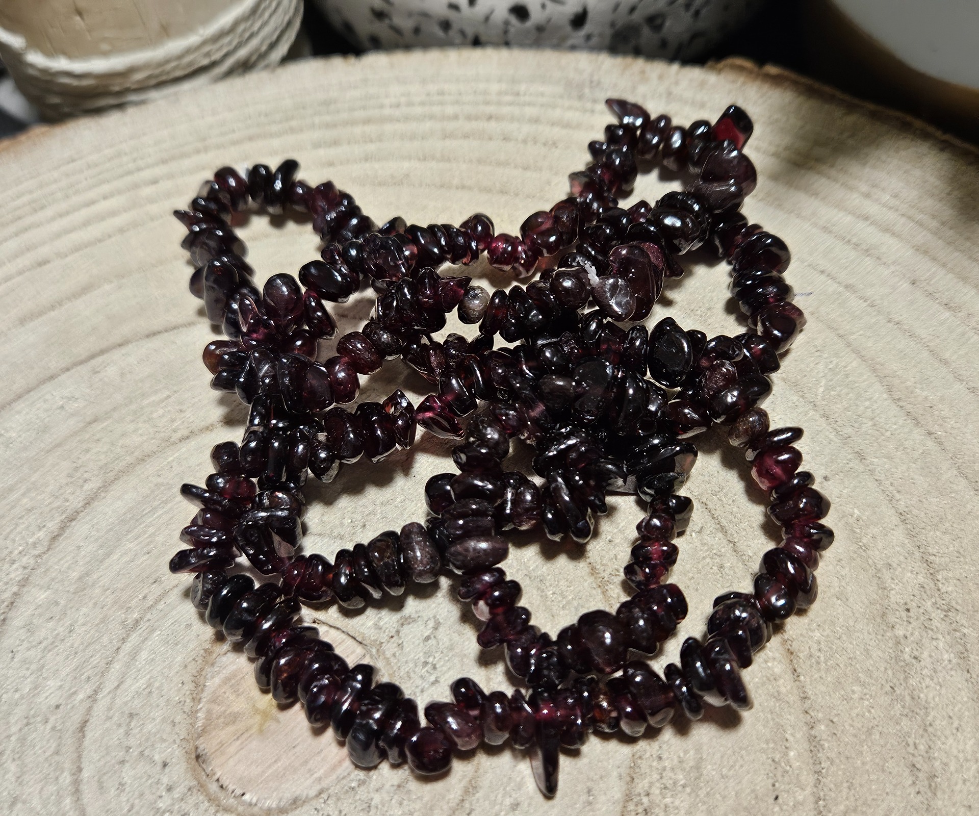 Ezt a karkötőt neked alkottam meg, ha imádod a nyers kövek zabolátlan szépségét. Itt nem tökéletes golyókat találsz, hanem apró, természetes gránát szilánkokat (splitter), amelyek megőrizték vad karakterüket és ősi erejüket. Minden egyes darab a csuklódon egyedi – van, amelyik sötét, mint az éjszaka, és van, amelyik a fény felé fordítva meleg borvörös színben izzik fel. A karkötőt rugalmas gumidamilra fűztem neked, így észrevétlenül simul a bőrödre, és nem fog zavarni sem a munka, sem a pihenés közben. A gránát ebben a formában olyan, mint egy személyes akkumulátor; azt mondják, összeköt a földdel és kitartást ad, amikor úgy érzed, fogytán az erőd. Egy valódi darabka természet, amit bárhová magaddal vihetsz.