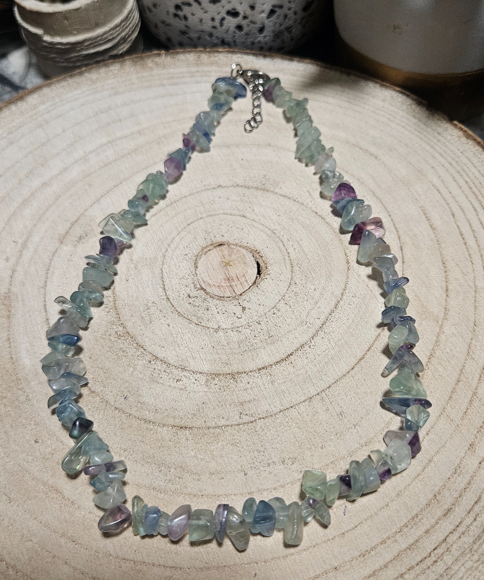 Ez a Fluorit splitter nyaklánc a természet művészi alkotása. A nyers, polírozott darabkák (splinterek) maximálisan visszaverik a fényt, feltárva a kő gyönyörű, réteges mintázatát (zöld, lila és kék árnyalatok). A kényelmes, 44–49 cm-es hosszának köszönhetően közvetlenül a szív és a torok csakra területén fejti ki hatását.