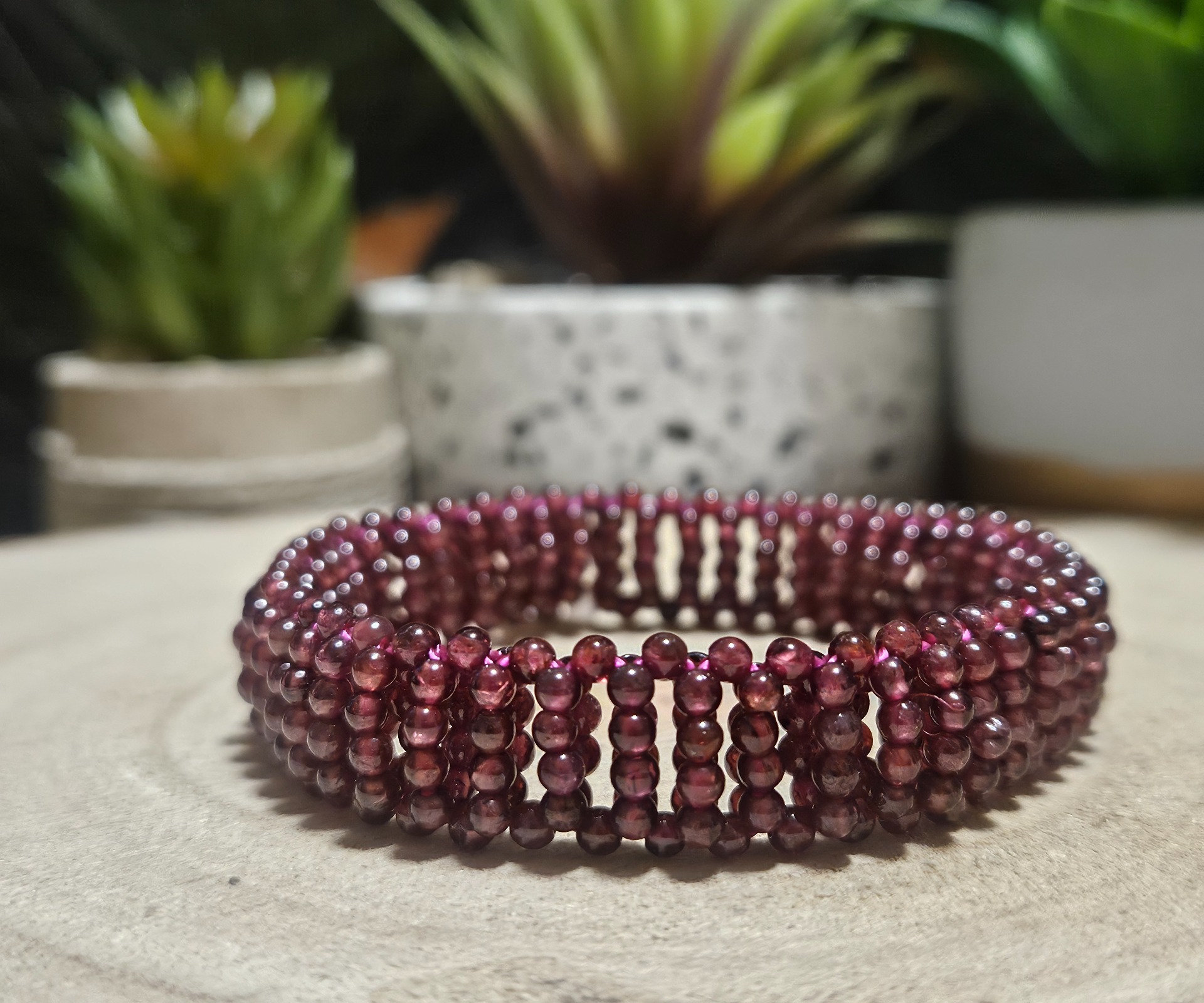 This refined bracelet is a celebration of the natural beauty and rich coloration of genuine garnet. It is crafted from multiple strands of tiny, carefully selected smooth beads with a diameter of only 2.5-3 mm, creating a rich and luxurious effect on the wrist. The smooth surface of the beads highlights the stone's deep burgundy color and adds a soft, silky luster to the piece. The bracelet is strung on a high-quality flexible elastic cord, ensuring it perfectly conforms to your wrist and provides comfort even during all-day wear. Garnet in this delicate form acts as a subtle but powerful energetic protector, supporting vitality and inner strength.
