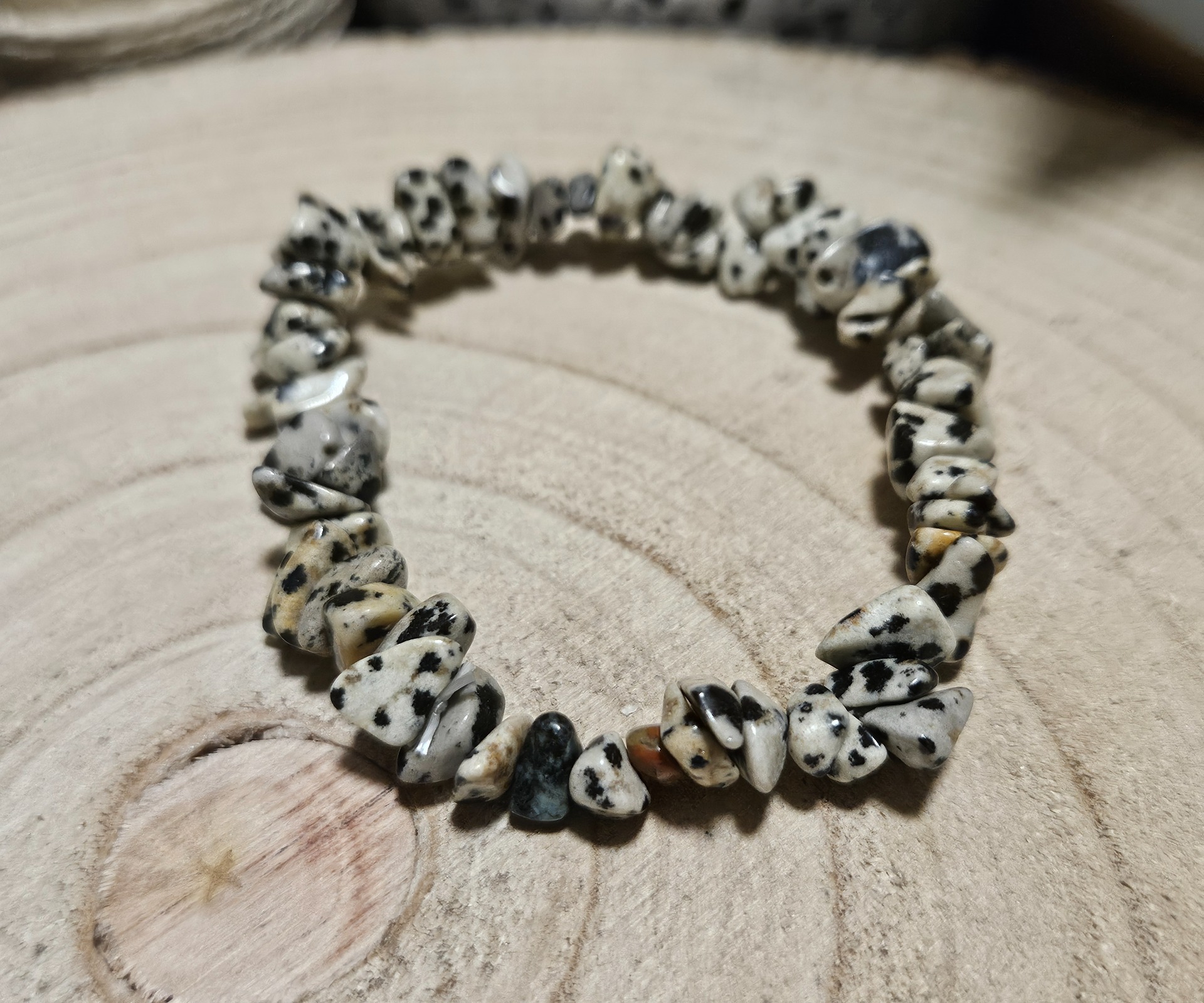 Ez a Dalmata jáspis „splitter” karkötő vidámságot és könnyedséget visz a mindennapokba. A gondosan csiszolt, de szabálytalan alakú kövek fehér és fekete foltokkal tarkított, egyedi mintázata a dalmata kutya játékosságát idézi. A rugalmas gumidamilra fűzött, kényelmes viseletű karkötő ideális választás mindazok számára, akik egy kis pozitív energiára vágynak az életükben.