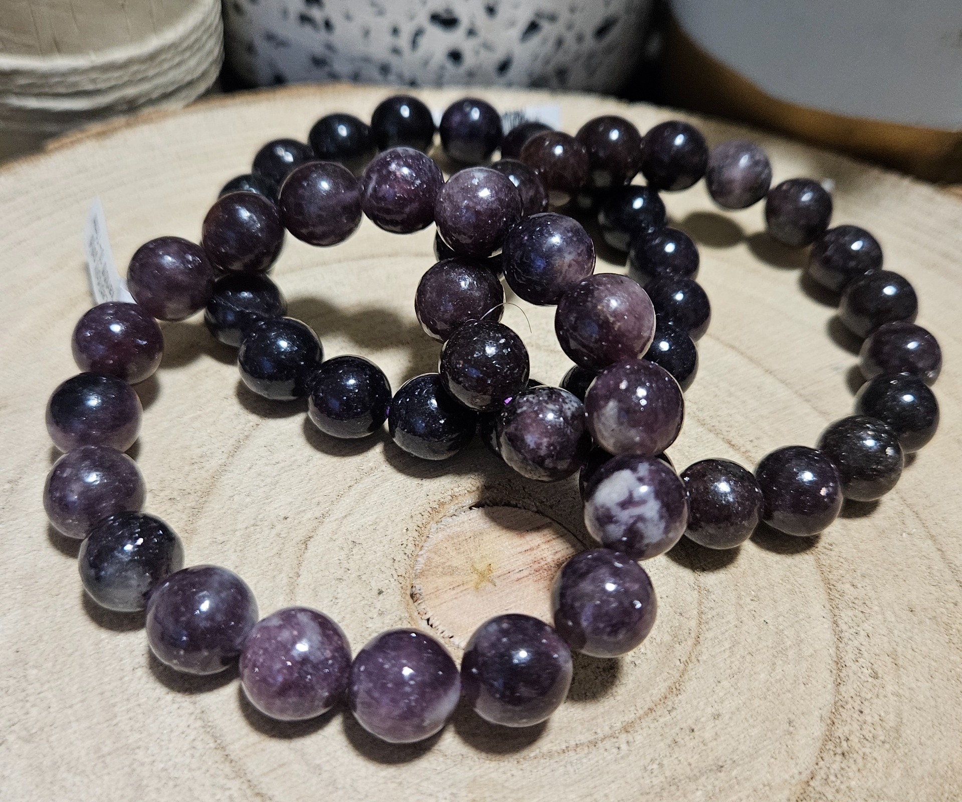 - Rozmer a Prevedenie: Vyrobené z väčších, cca 10–11 mm leštených Lepidolitových korálok, navlečené na pružnej gumičke.