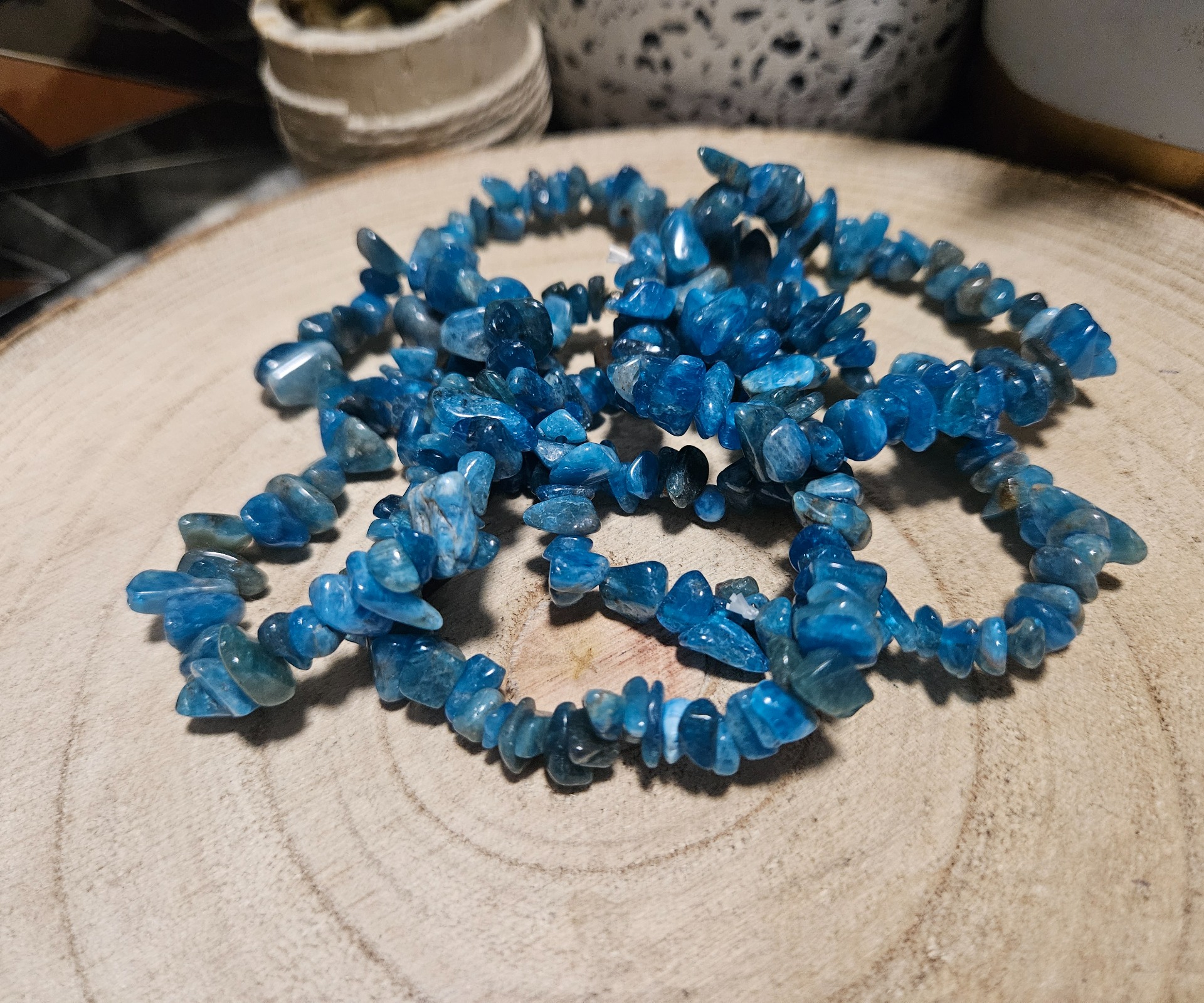Ez a gyönyörű Kék Apatit splitter karkötő a kő természetes, élénk kék energiáját viszi a mindennapokba. A kisebb, szabálytalan formájú csiszolt Apatit darabok rugalmas gumidamilra vannak fűzve, így a karkötő kényelmesen illeszkedik a 16-18 cm-es csuklómérethez. A splitter forma lehetővé teszi, hogy az ásvány energiája folyamatosan áramoljon a test körül.