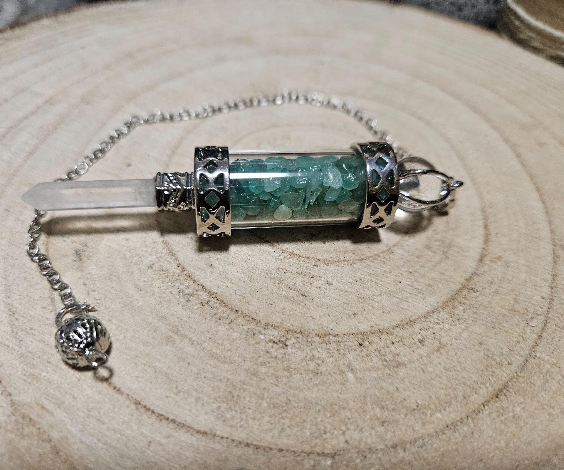Toto profesionálne kyvadlo "Imperial Crystal Guide" s celkovými rozmermi 1,8 x 8 cm predstavuje sofistikovaný nástroj pre prácu s energiou. Jadro kyvadla tvorí sklenená ampulka naplnená drobnými úlomkami prírodného zeleného aventurínu. Spodná časť je zakončená precízne vybrúseným hrotom z číreho horského krištáľu, zatiaľ čo hornú časť zdobí detailne vypracovaný kovový dekor v striebornej farbe. Kyvadlo je zavesené na jemnej kovovej retiazke, ktorá umožňuje plynulý a citlivý pohyb pri hľadaní odpovedí.