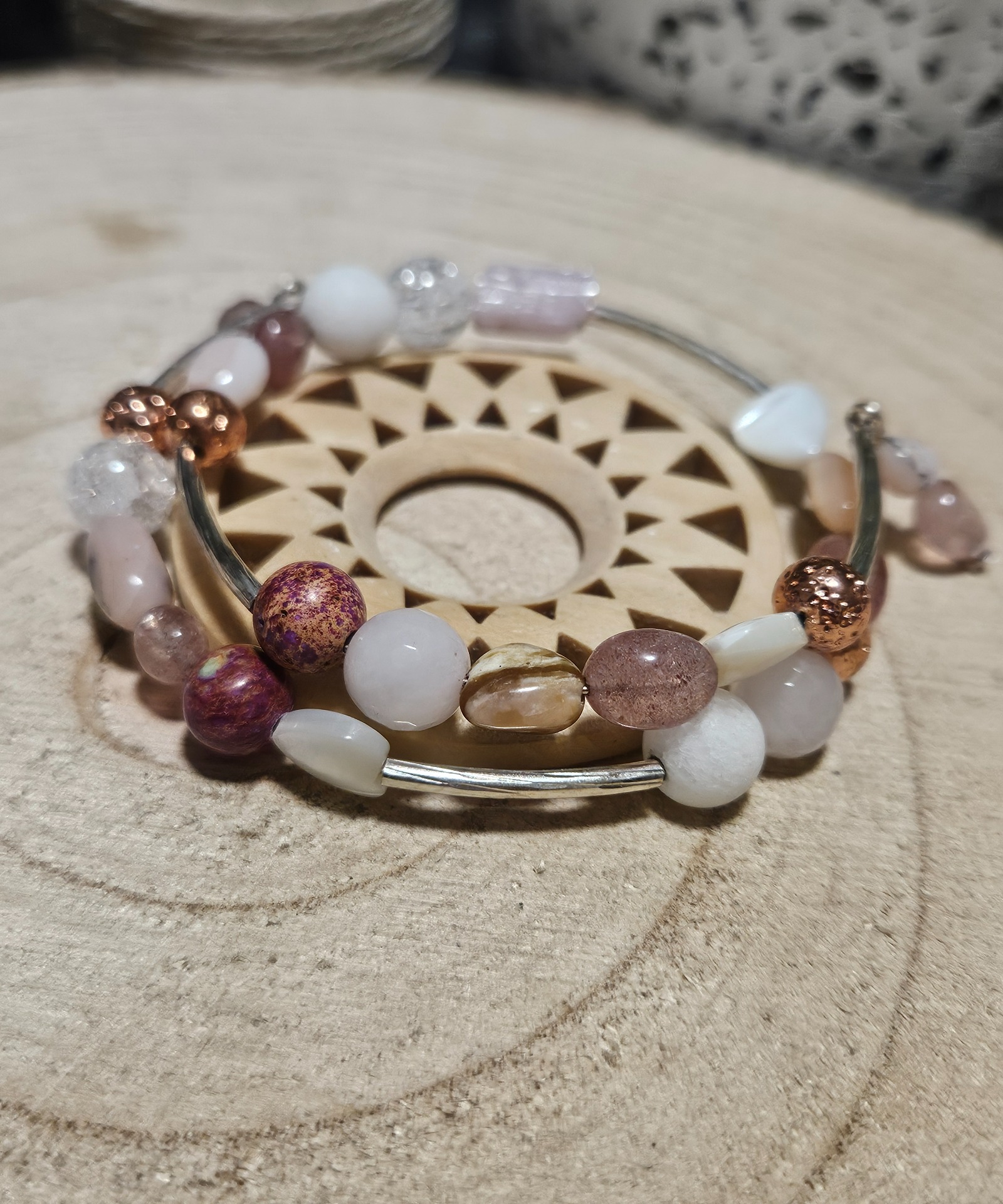 Tento vlastnoručne vyrobený umelecký šperk "Imperial Divine Harmony" je absolútnym unikátom našej kolekcie, z ktorého existuje len jediný kus na svete ❤️. Náramok je vytvorený na viacradovom pamäťovom drôte, ktorý si zachováva svoj tvar a dokonale obopne zápästie. Hlavnou hviezdou je vzácny kunzit, ktorý dopĺňa starostlivo vybraná symfónia minerálov: jahodový kremeň, jaspis regalit, ruženín, praskaný krištáľ, andský opál, perleť a biely jadeit. Táto bohatá kompozícia textúr a jemných farieb vytvára luxusný a neprehliadnuteľný šperk.