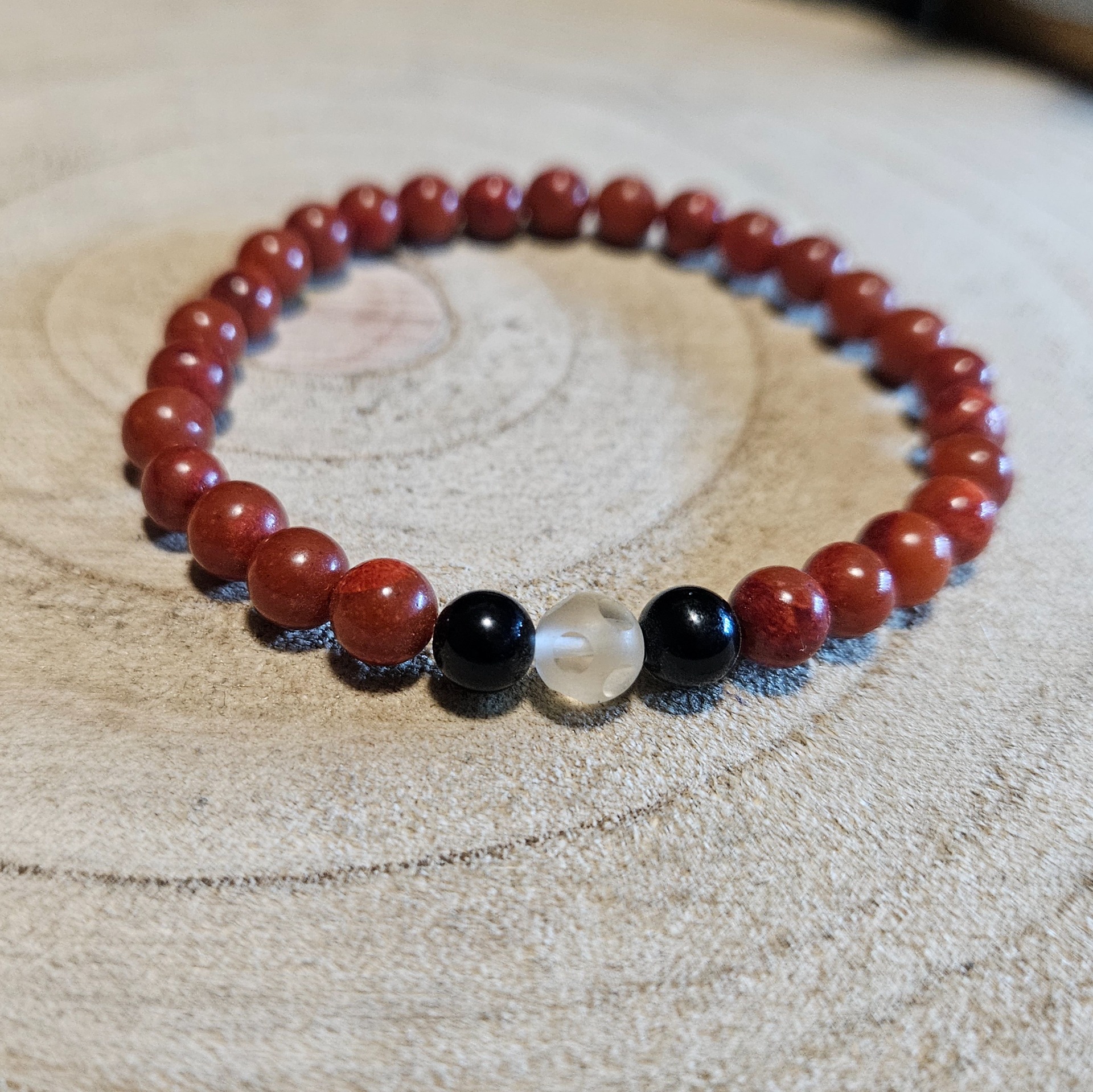 Are you looking for a companion that grounds you and clears your path at the same time? This handmade bracelet from the Imperial line combines three powerful forces of nature. The reddish jasper beads provide stability and vital force, while the two black obsidian beads in the center act as a shield against negative influences. The sequence is crowned by a clear rock crystal bead, which amplifies the effects of the other minerals and brings light into your daily life. Thanks to the elastic cord, this 18-19 cm piece fits comfortably on your wrist.