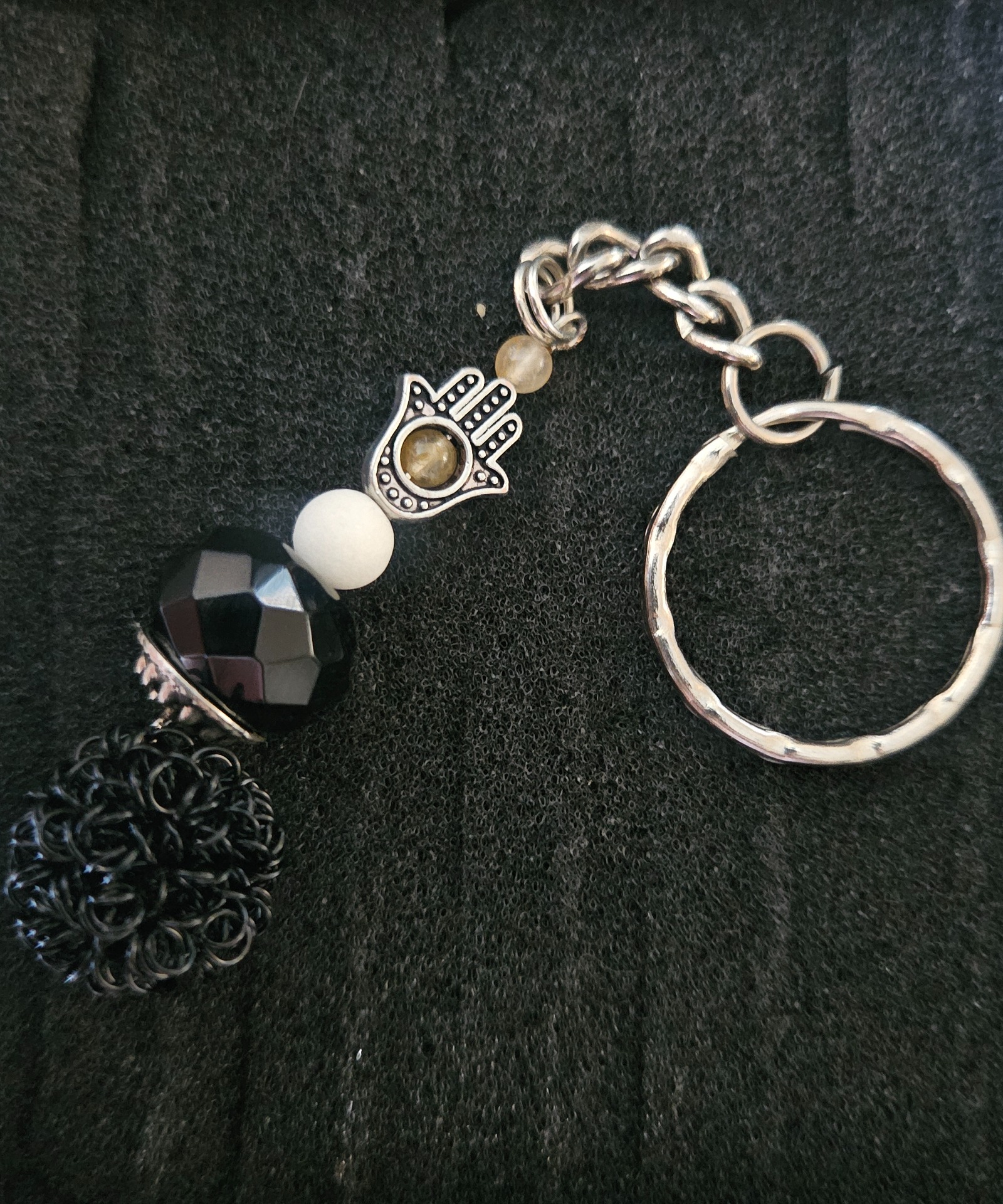 This unique, handcrafted piece is the pinnacle of our collection. The "Imperial Hamsa" keychain blends deep black onyx with warming carnelian and harmonizing jadeite, featuring the Hamsa (Hand of Fatima) as its central motif. Every detail is the result of meticulous handwork, turning this accessory into a personal totem that protects you at every step. It is a fusion of tradition and craft, designed to bring order and protection into your daily life.