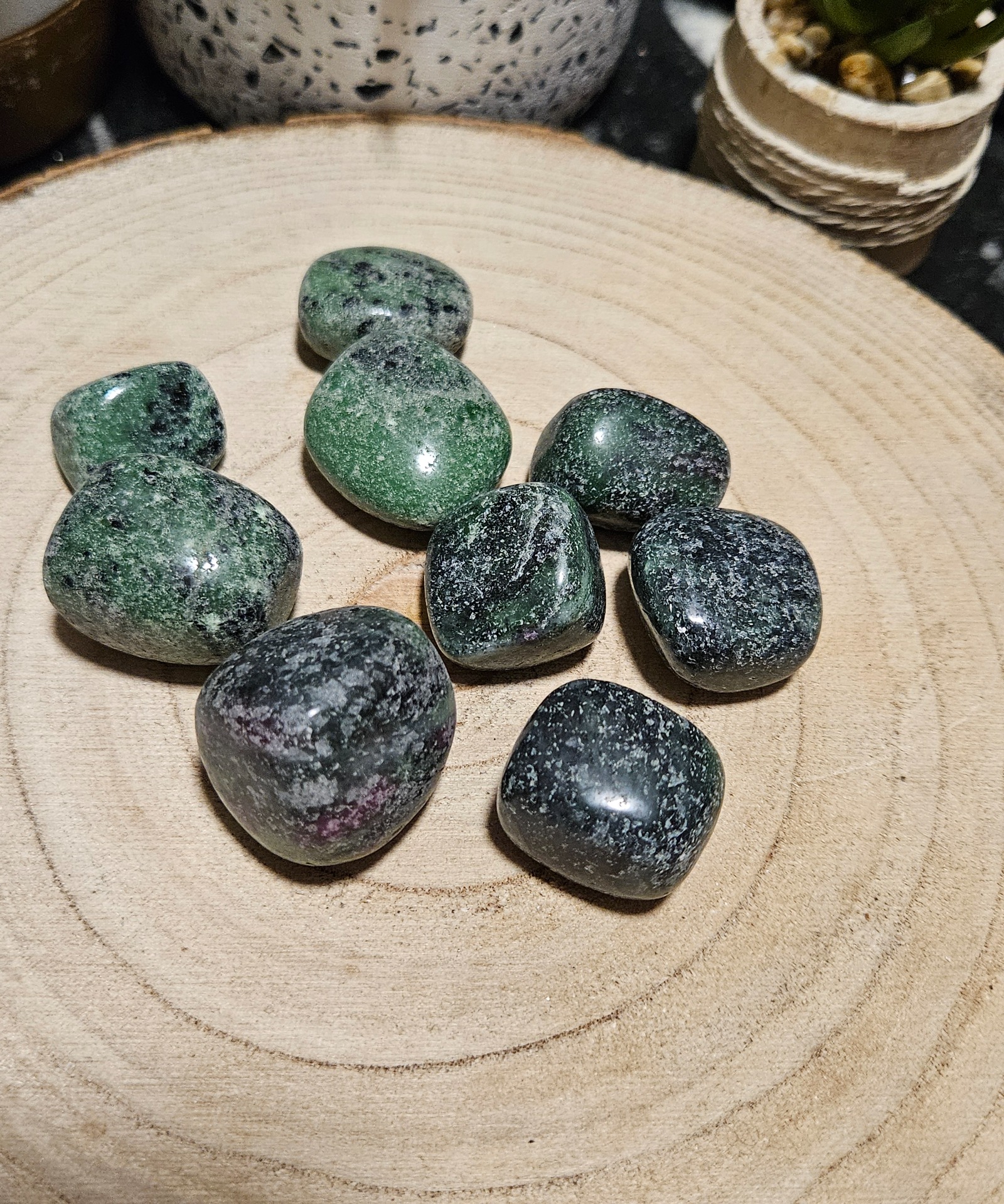 These natural tumbled "Imperial Heart Guardian" Ruby in Zoisite stones range in size from 2-3 cm. Each piece features a unique pattern where deep green zoisite blends with dark inclusions and red ruby spots. The stones have a smooth, polished finish that is very pleasant to the touch. The product is sold via random selection, ensuring you receive your own unique piece of nature.