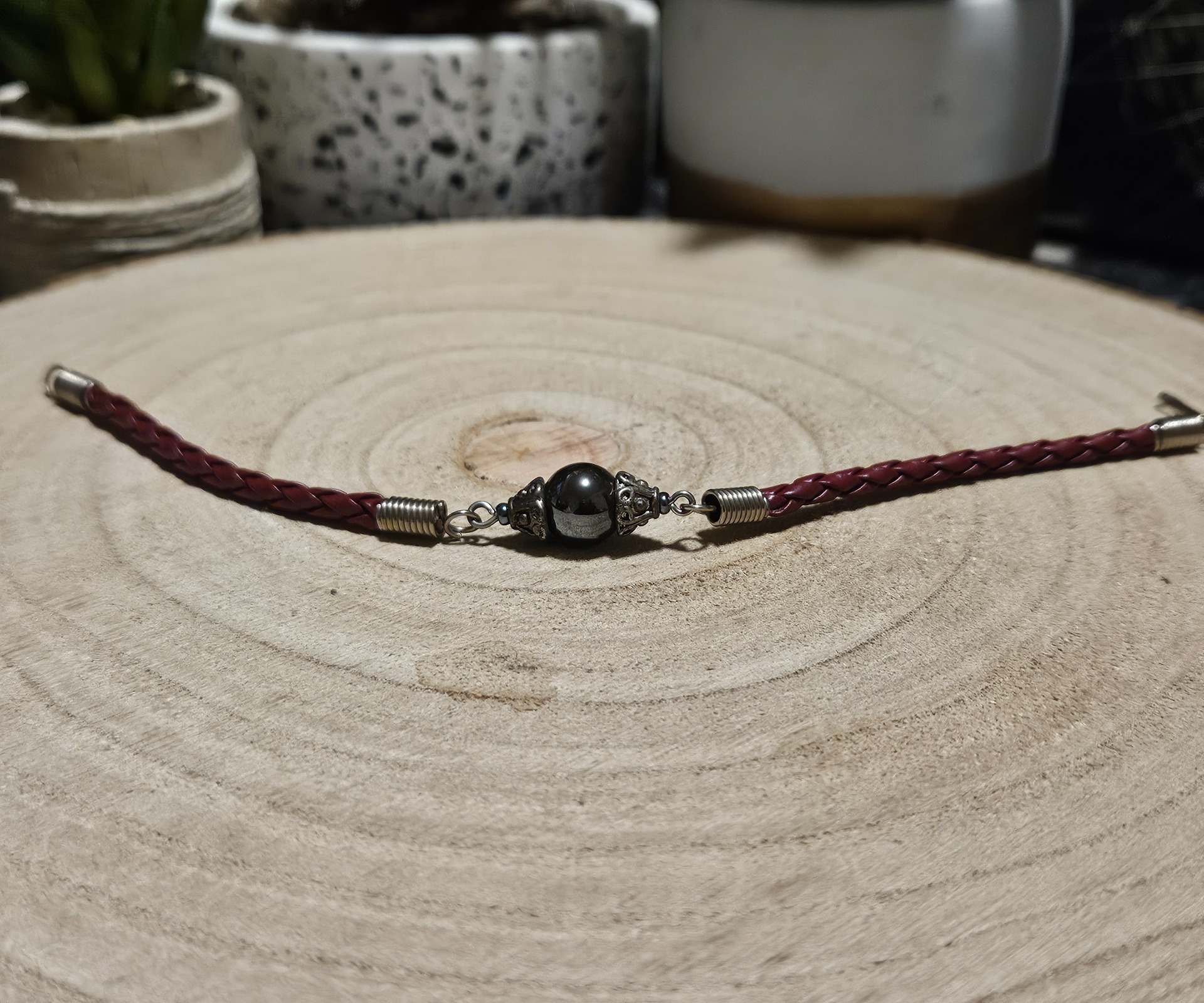 Doplňte svoj štýl týmto elegantným kúskom z línie Imperial, ktorý spája surovú silu prírodného minerálu s jemným remeselným spracovaním. Centrálnym prvkom je dokonale vyleštená hematitová korálka, ktorú z oboch strán zdobia detailné kovové medzikusy s kvetinovým motívom. Remienok je vyrobený z kvalitnej pletenej kože v sýtej bordovej farbe a je vybavený praktickým zapínaním na karabínku.