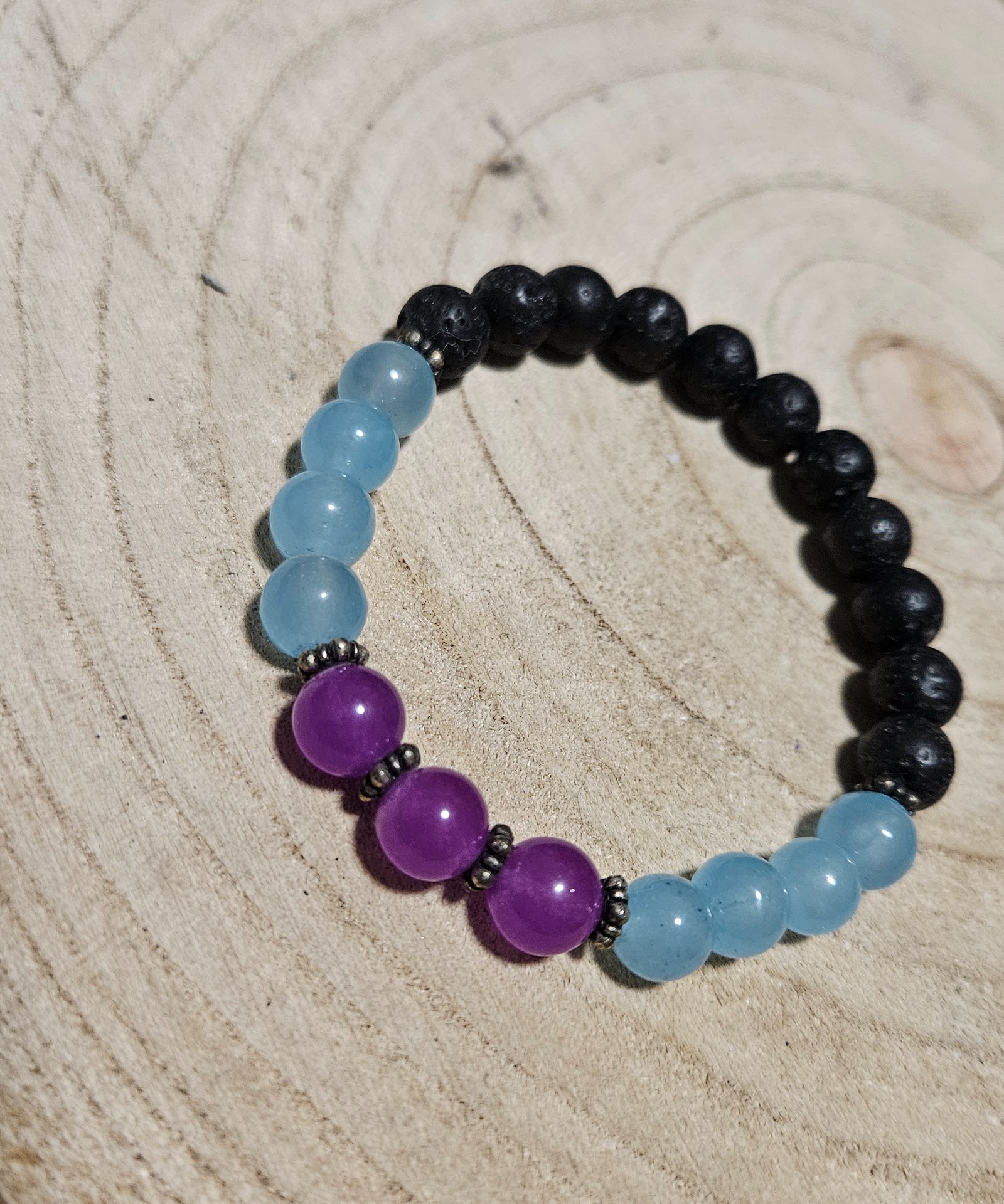 Dive into the depths of serenity with this handcrafted bracelet, blending mystical purple and calming blue jadeite with the elemental power of black lava. This 17-18 cm long piece offers an elegant yet protective look. It is the perfect choice for those seeking spiritual balance and a stylish accessory in one, whether for everyday wear or special occasions.
