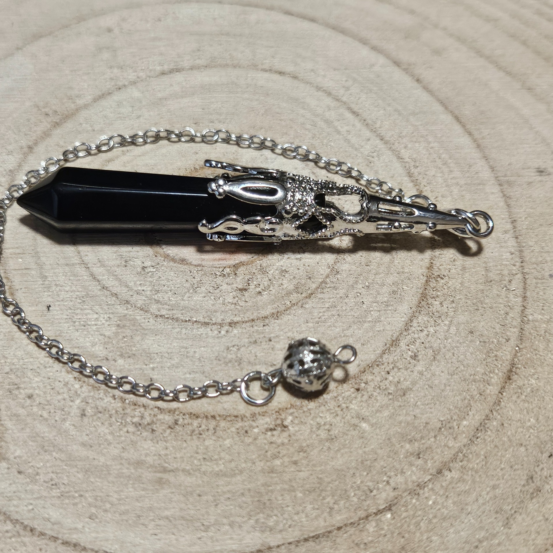 Are you seeking clear answers in uncertain times? This pendulum from the Imperial line will help you find them. Handcrafted black obsidian in a point shape is set within a detailed metal crown, symbolizing authority over your own destiny. Its weight and balance ensure perfect sensitivity to subtle energetic vibrations, while the metal bead at the end of the chain allows you a firm grip during every ritual.