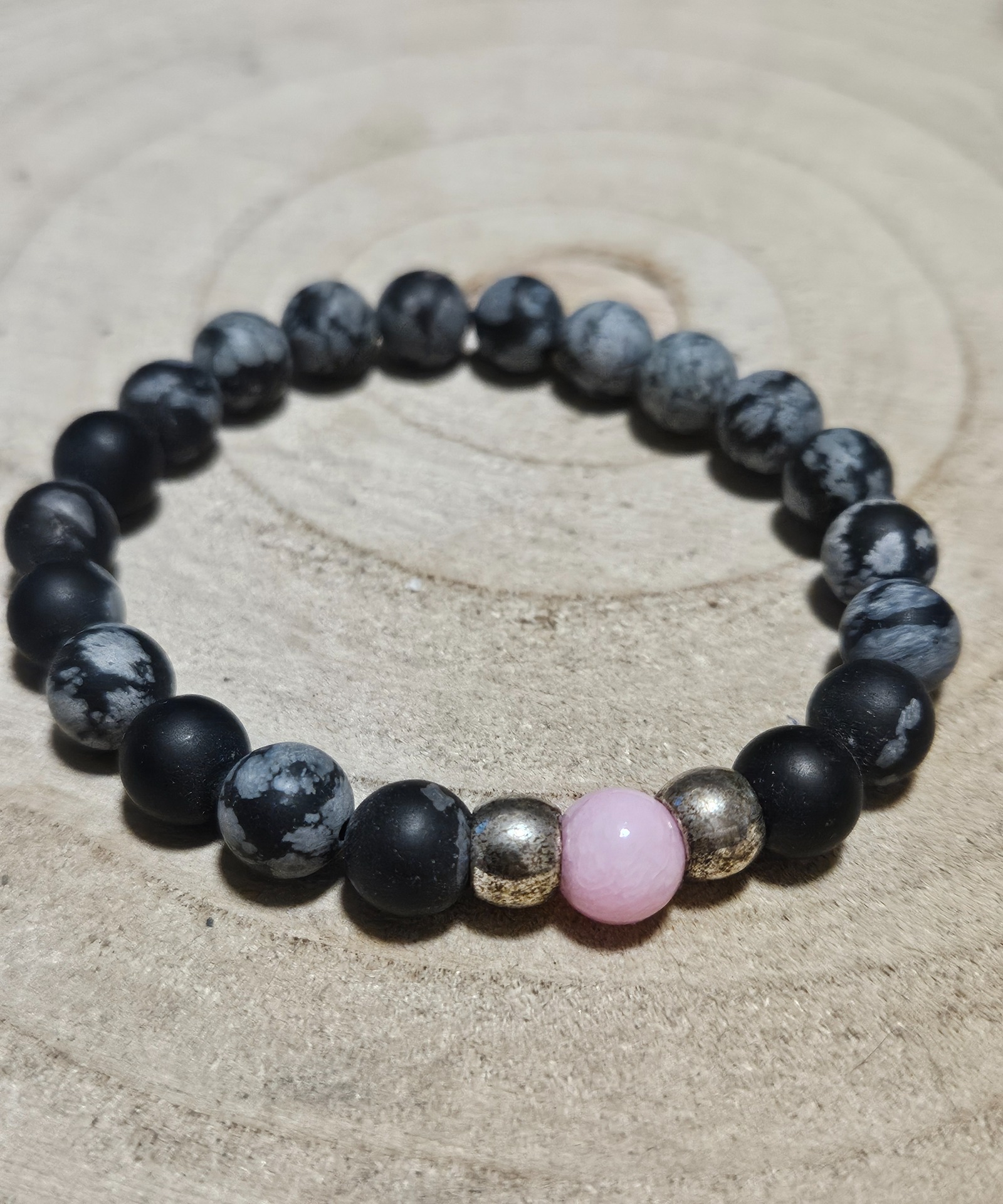 Vločkový obsidián je známy ako kameň pravdy a silnej ochrany, ktorý pomáha vyniesť na povrch potlačené emócie a vyčistiť ich. Jediný korálik ružového jadeitu v tejto kompozícii pôsobí ako "ostrov pokoja", ktorý zjemňuje drsnú energiu obsidiánu a prináša nositeľovi pocit bezpečia a láskavosti. Z fyzického hľadiska táto kombinácia podporuje tráviaci systém a pomáha pri detoxikácii organizmu, zatiaľ čo kontakt s týmito kameňmi na zápästí dodáva pocit stability a emočnej jasnosti.