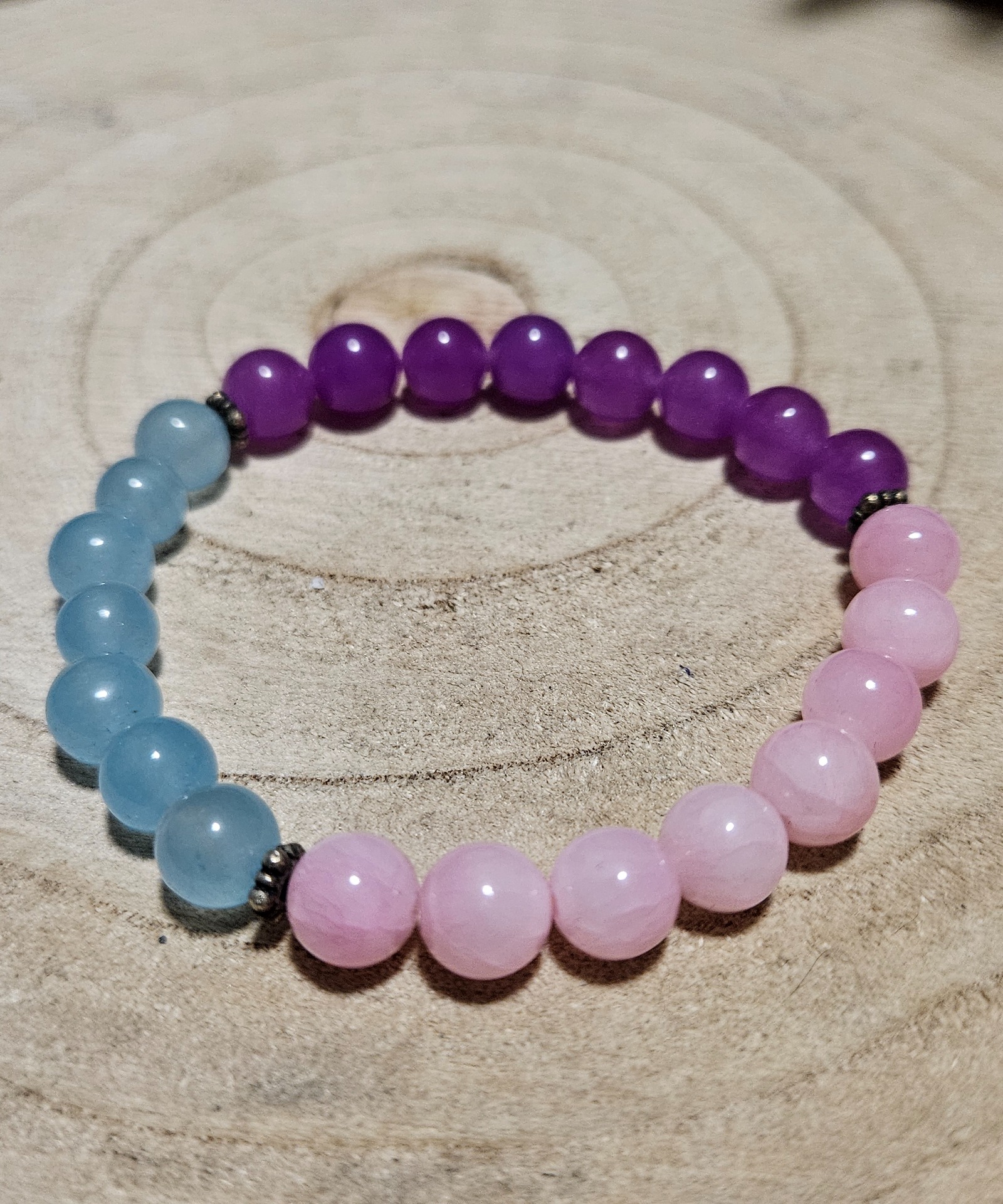 Tento trojfarebný náramok je skutočným generátorom pozitívnej energie. Ružový jadeit otvára srdce láske, lila podporuje duchovný rast a modrý prináša pokoj do každodennej komunikácie. Spoločne tieto kamene vytvárajú emocionálnu rovnováhu a pomáhajú odbúravať stres. Z hľadiska zdravia sa tejto kombinácii pripisuje schopnosť harmonizovať hormonálny systém a podporovať vnútorný pokoj, čo vedie k lepšej regenerácii organizmu a celkovému pocitu pohody.