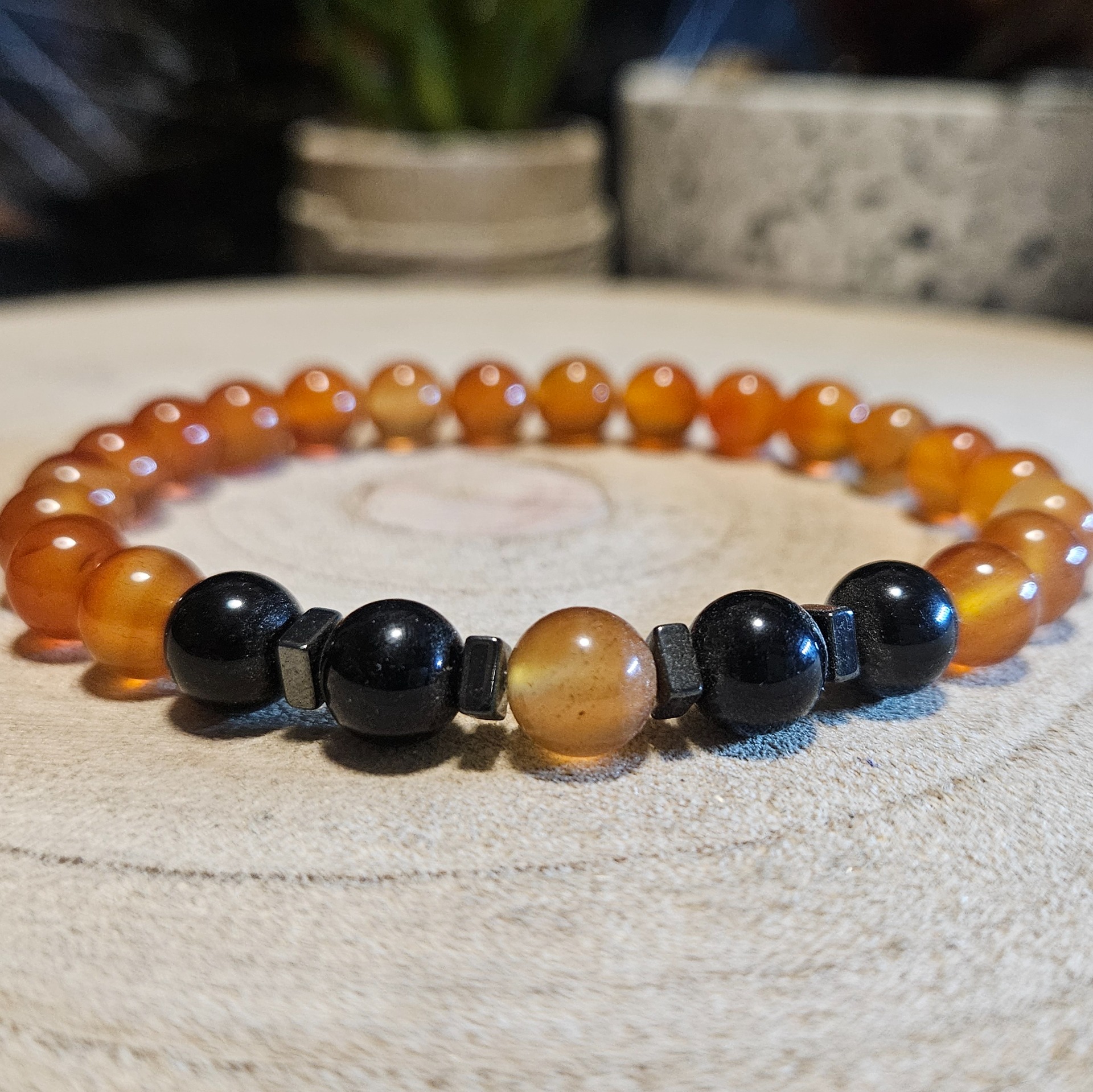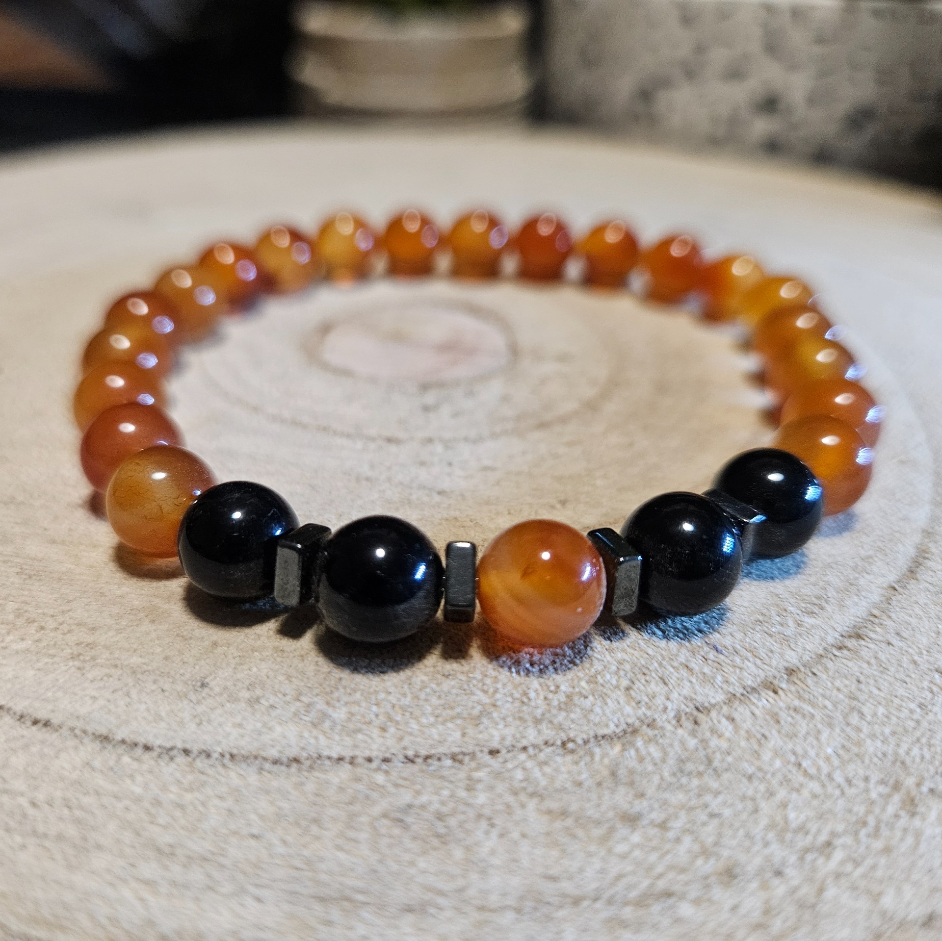 Tento šperk je majstrom v čistení Koreňovej čakry. Hematit pomáha pri regenerácii a dobíjaní energie, zatiaľ čo karneol stimuluje krvný obeh a sakrálnu čakru. Na mystickej úrovni toto spojenie minerálov predstavuje alchýmiu zeme a ohňa, ktorá prináša vytrvalosť a vnútorný pokoj.