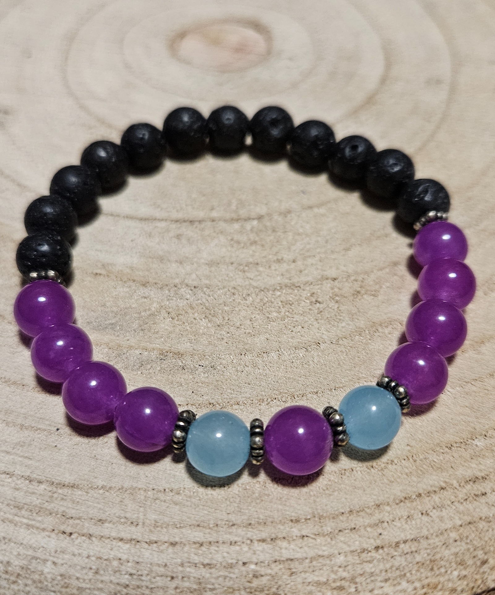 Tento náramok je symbolom duchovnej zrelosti a vnútornej stability. Lila jadeit pomáha pri hľadaní zmyslu a vnútornej múdrosti, zatiaľ čo modré akcenty podporujú jasné vyjadrovanie myšlienok. Lávový kameň ako nositeľ ohnivej energie zeme dodáva nositeľovi vitalitu a odvahu čeliť každodenným výzvam. Z hľadiska pohody kombinácia týchto minerálov pomáha uzemniť rozlietané myšlienky a znižovať pocit únavy. Pórovitá láva navyše umožňuje aplikáciu esenciálnych olejov, čo robí z náramku váš osobný energetický žiarič.