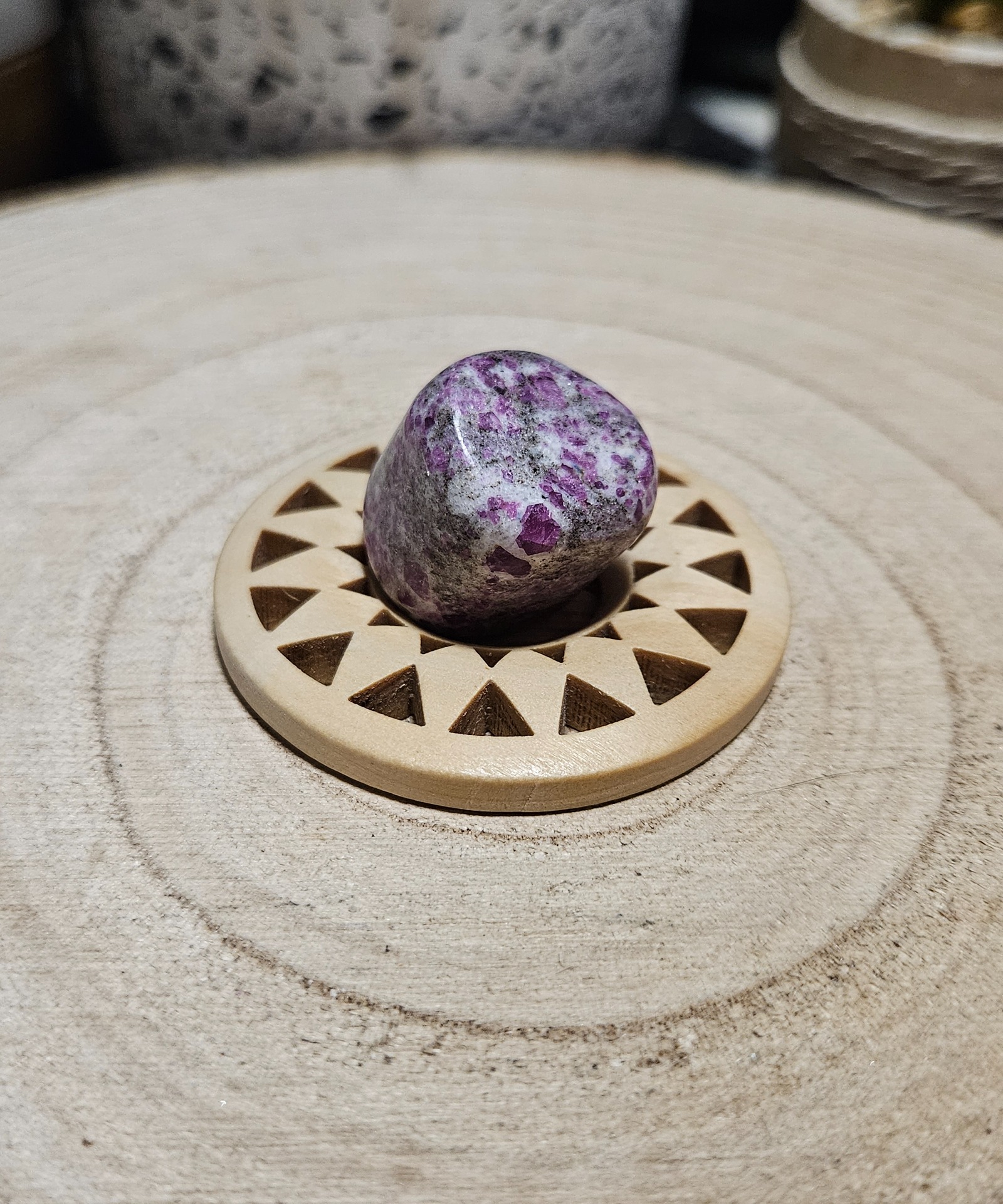 Tento harmonický kúsok "Imperial Ruby Path" má hmotnosť 19 g a veľkosť 2 cm. Prírodné rubínové inklúzie sú rovnomerne rozložené v svetlej minerálnej matrici živca, čo dodáva kameňu vyvážený a estetický vzhľad. Hladký povrch vznikol precíznym tromlovaním, ktoré zvýrazňuje kontrast medzi zemitou energiou živca a kráľovskou farbou rubínu.