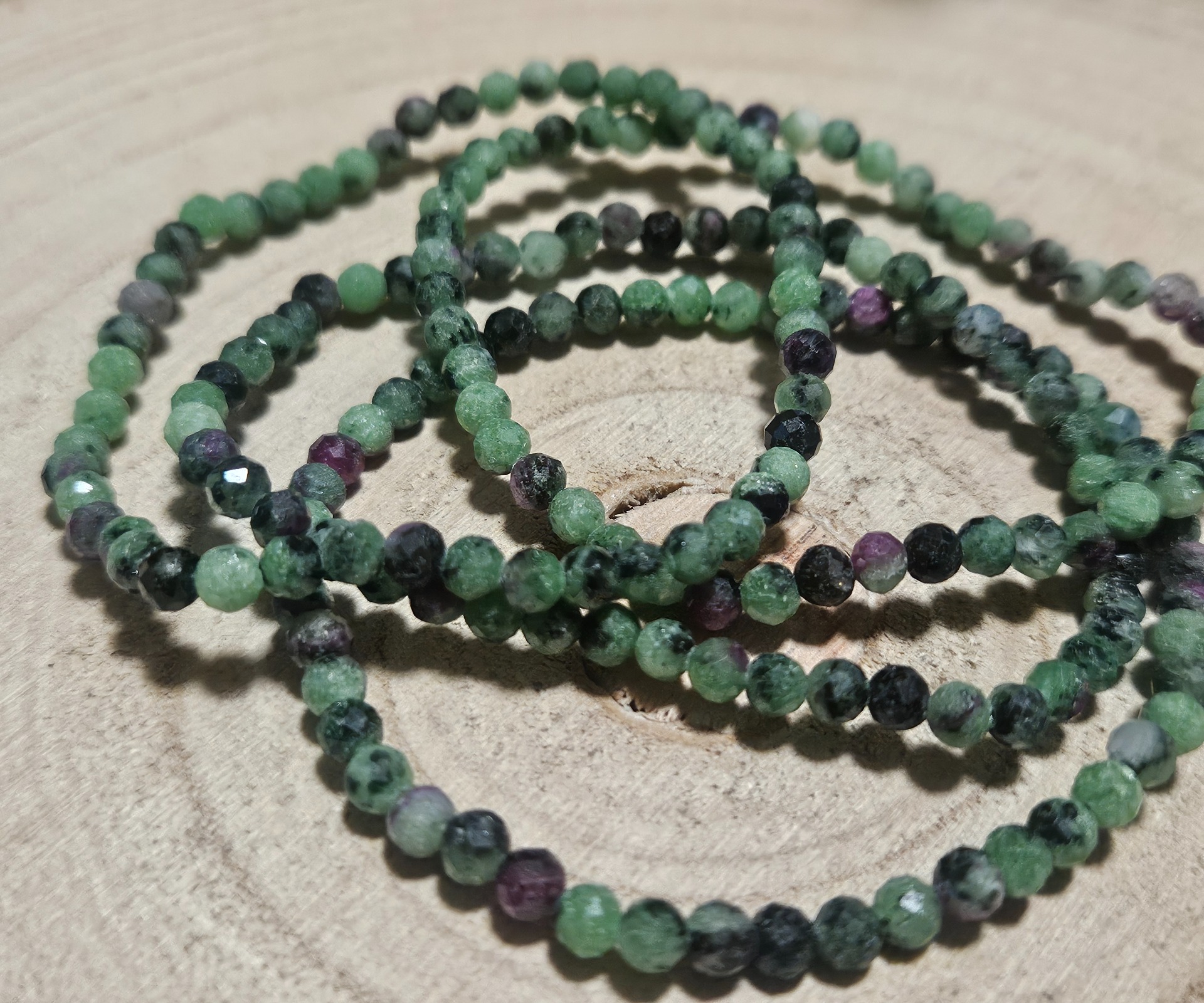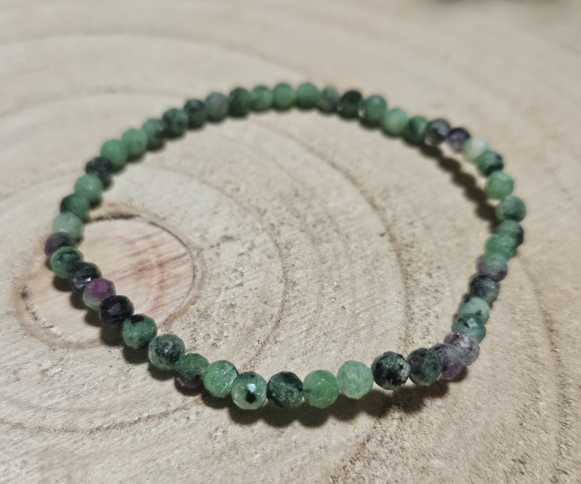 Ez az elegáns "Imperial Ruby Spark" karkötő apró, 4 mm-es természetes rubin-zoizit szemekből áll. Az ásványok precízen fazettáltak (csiszoltak), ami az ékszernek luxus csillogást és dinamikát kölcsönöz a csukló minden mozdulatánál. Az ékszert minőségi rugalmas gumidamilra fűztük, amely ideális a 16-18 cm-es csuklómérethez. Az ásványok textúrájában gyönyörűen kiegészítik egymást a zoizit zöld tónusai és az apró rubin zárványok.