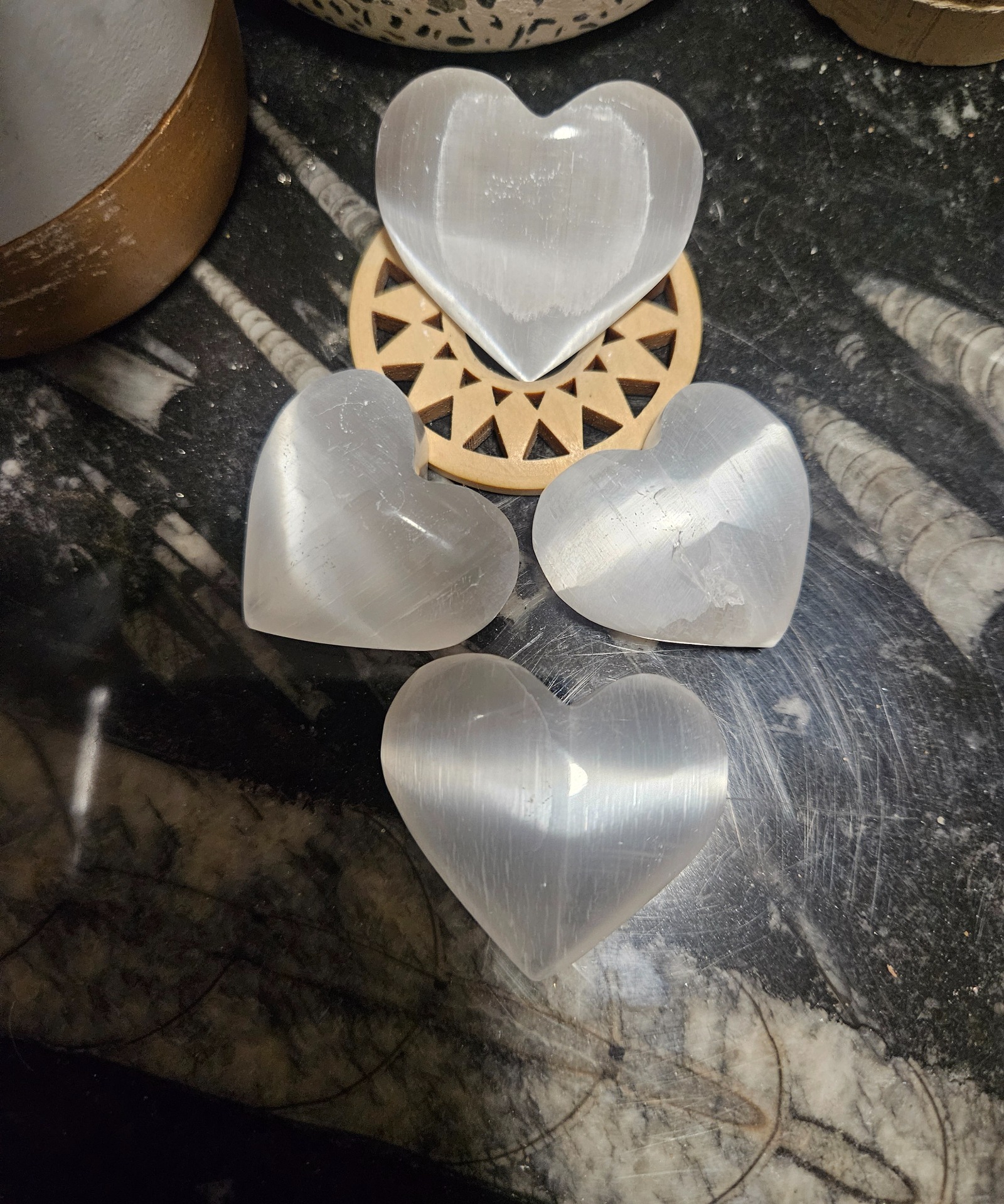 Selenitové srdce silne pôsobí na Korunnú čakru a čakru Tretieho oka, ale vďaka svojmu tvaru prináša svetlo aj do Srdcovej čakry. Mystika tohto tvaru spočíva v prepojení božského pokoja s ľudským citom. Na fyzickej úrovni pomáha pri uvoľňovaní napätia v tele, zmierňuje bolesti hlavy spôsobené stresom a podporuje hlbokú relaxáciu celého organizmu.