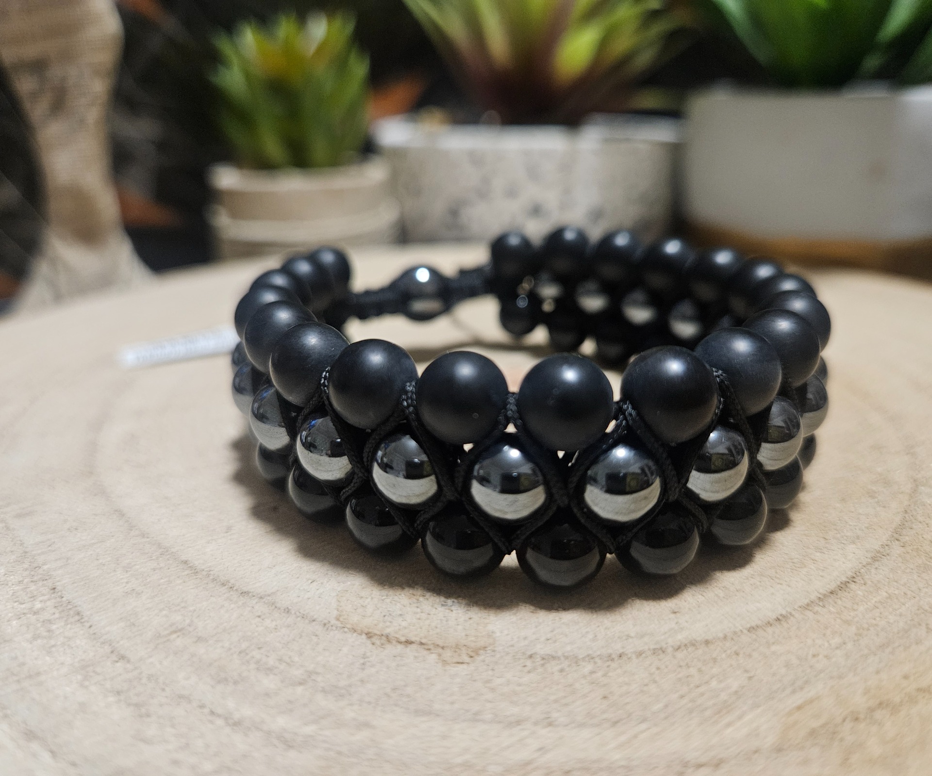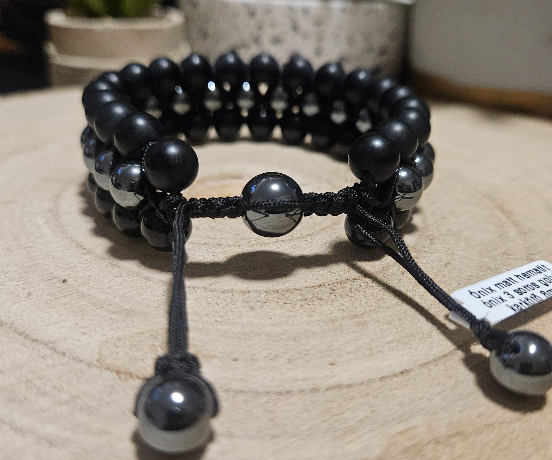 From a health perspective, this combination of minerals is a strong ally for overall detoxification and stabilization of blood pressure. Matte onyx aids in concentration and mitigates the effects of stress on the nervous system, while hematite, with its high iron content, supports red blood cell production and accelerates tissue regeneration. Together, they act as a generator of stability, helping the body maintain its vitality even during exhausting days.