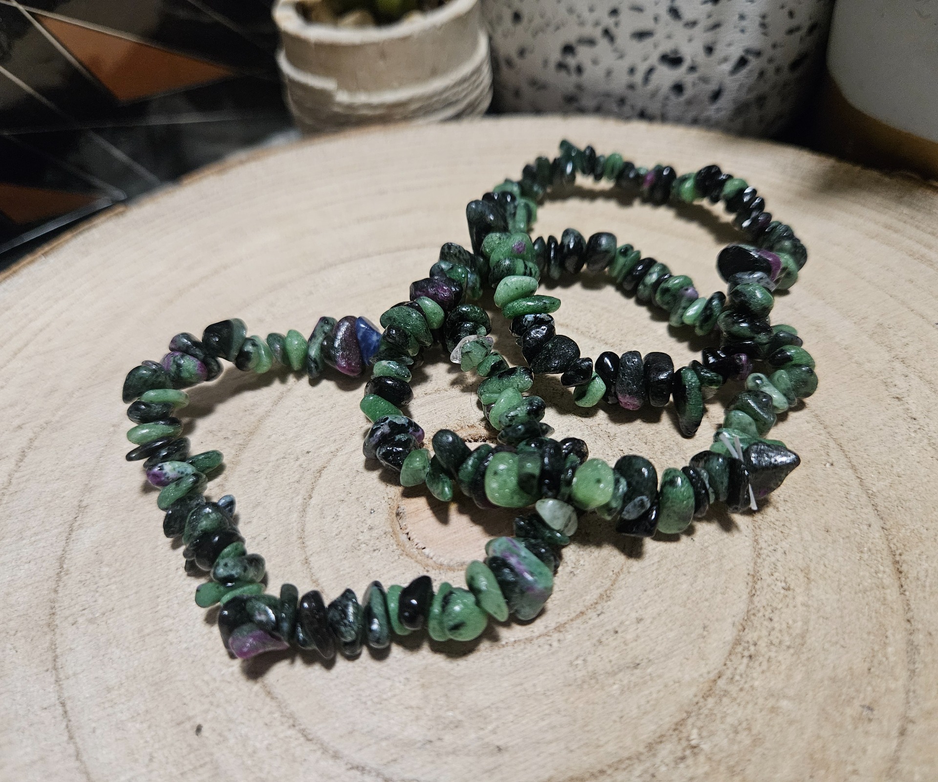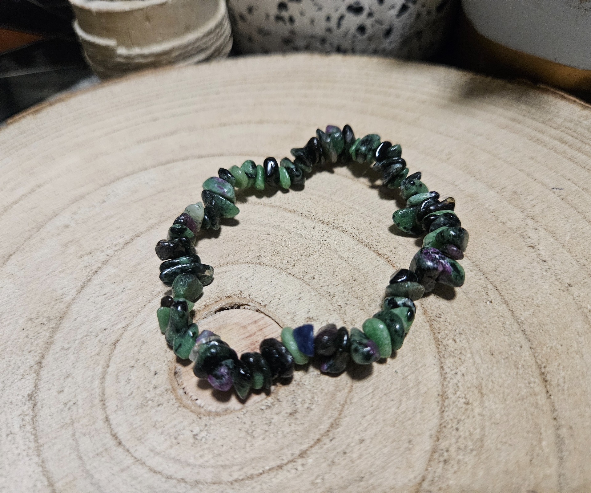 Ez az "Imperial Wild Vitality" karkötő természetes rubin-zoizit szabálytalan törmelékes darabjaiból készült, amelyek kiemelik az ásvány nyers karakterét. A törmelékes (splitter) csiszolás izgalmas textúrát hoz létre, amelyben a zoizit zöld tónusai dominálnak, élénkvörös rubin pettyekkel és fekete amfibol zárványokkal tarkítva. Az ékszert kiváló minőségű rugalmas gumidamilra fűztük, amely kényelmesen illeszkedik a 16-18 cm-es csuklómérethez.