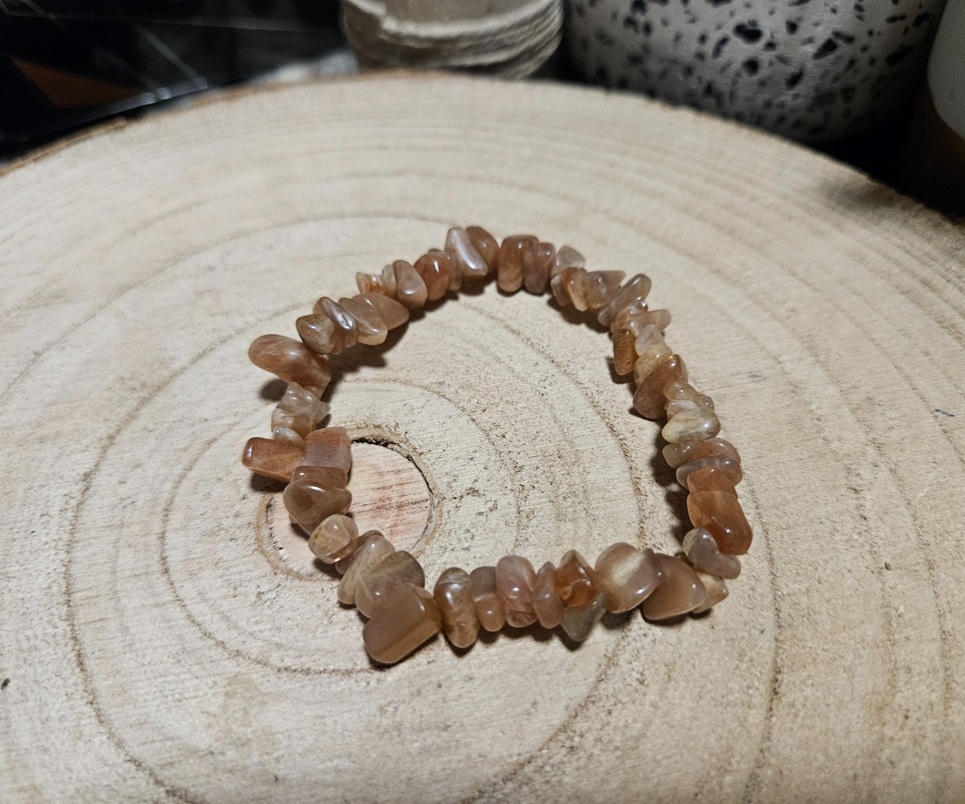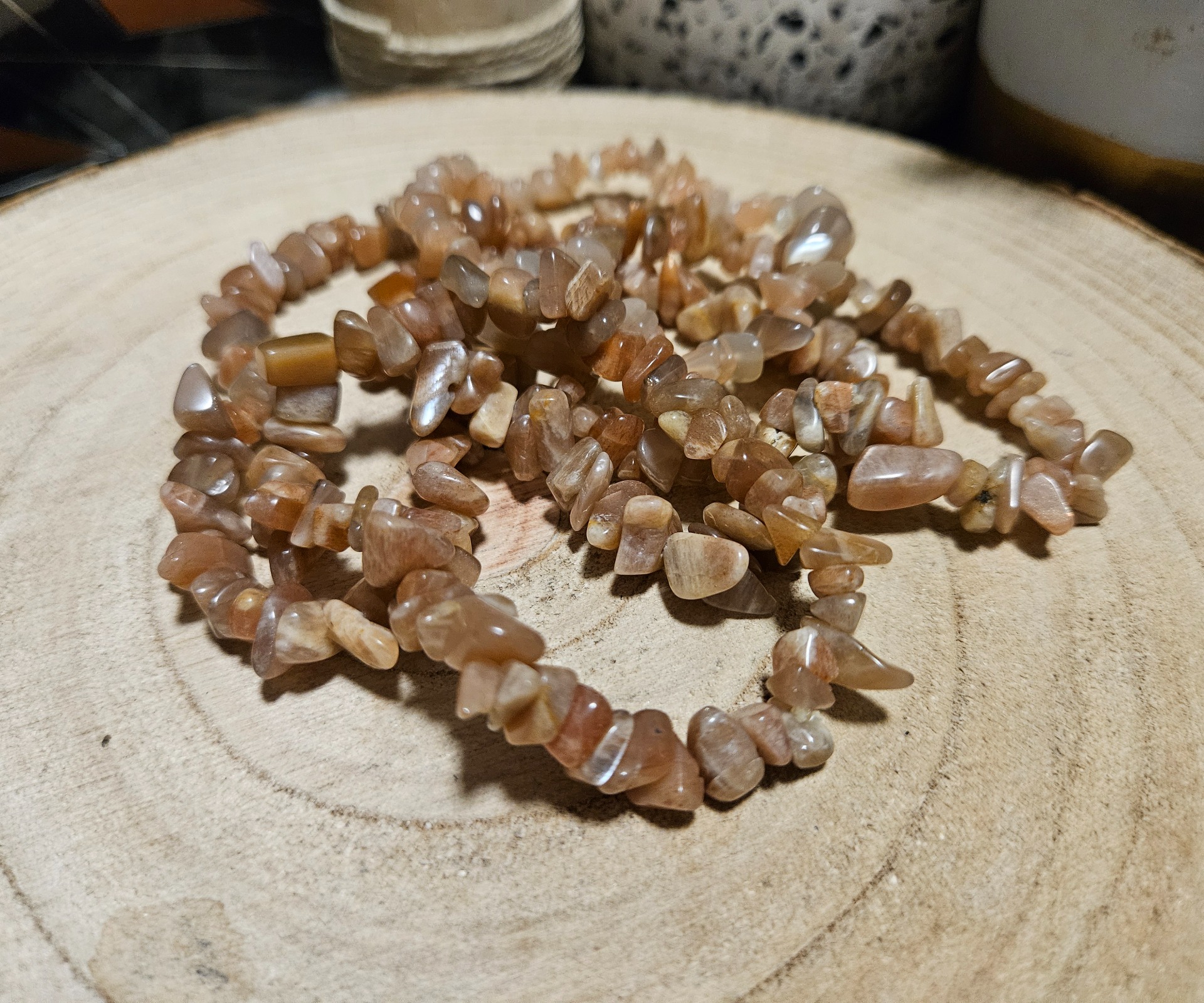 - Megjelenés: Szabálytalan kristályszilánkokból (splitter) álló karkötő, barackos, bézs és narancsos adulár árnyalatokban.