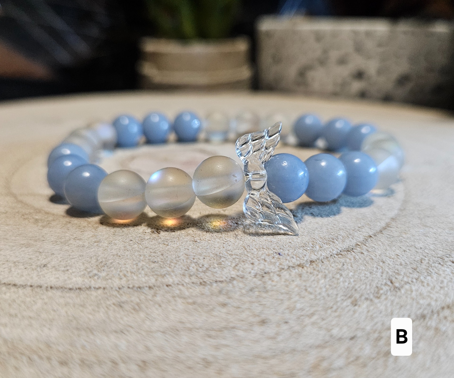 Tento špeciálny náramok je jedinečnou kombináciou dvoch silných minerálov, angelitu a aura kremeňa, ktoré podporujú duševnú harmóniu a pozitívnu energiu. Angelit so svojou bledomodrou, upokojujúcou energiou uvoľňuje napätie a úzkosť, podporuje vnútorný pokoj a duchovnú komunikáciu. Aura kremeň vzniká spojením čistého kremeňa s kovmi, ktoré vyžaruje mimoriadne vysokú frekvenciu, dúhové svetlo, ktoré nabíja nositeľa vitalitou a optimizmom.