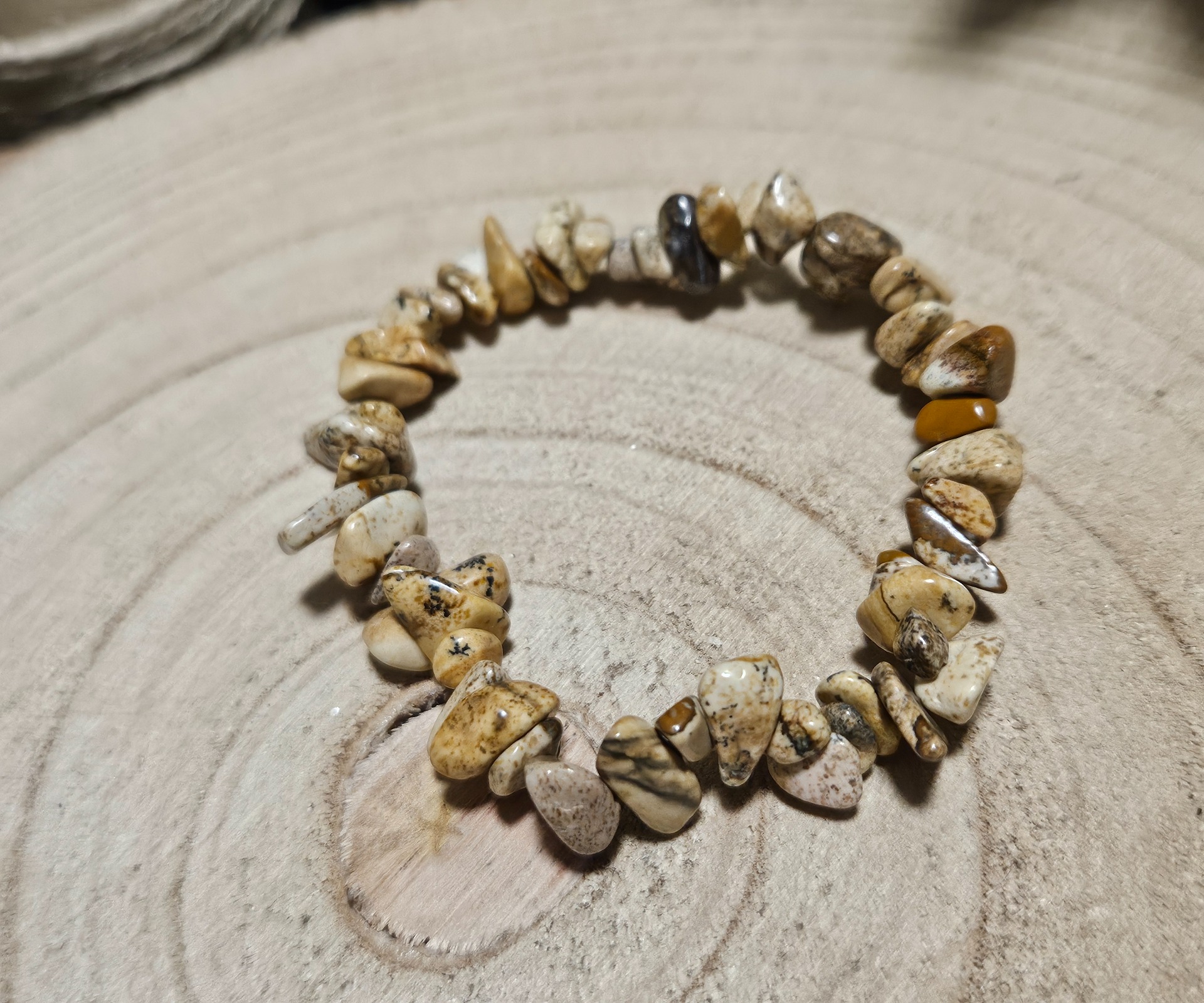 Tento náramok z jaspisu Kalahari, vyrobený z úlomkov, oslavuje nedotknutú krásu prírody. Starostlivo brúsené, no nepravidelné kamienky vytvárajú jedinečný, organický vzor, ktorý evokuje nekonečné krajiny púšte Kalahari. Pohodlné nosenie na pružnej šnúrke pomáha cítiť silu tohto prírodného minerálu každý deň.