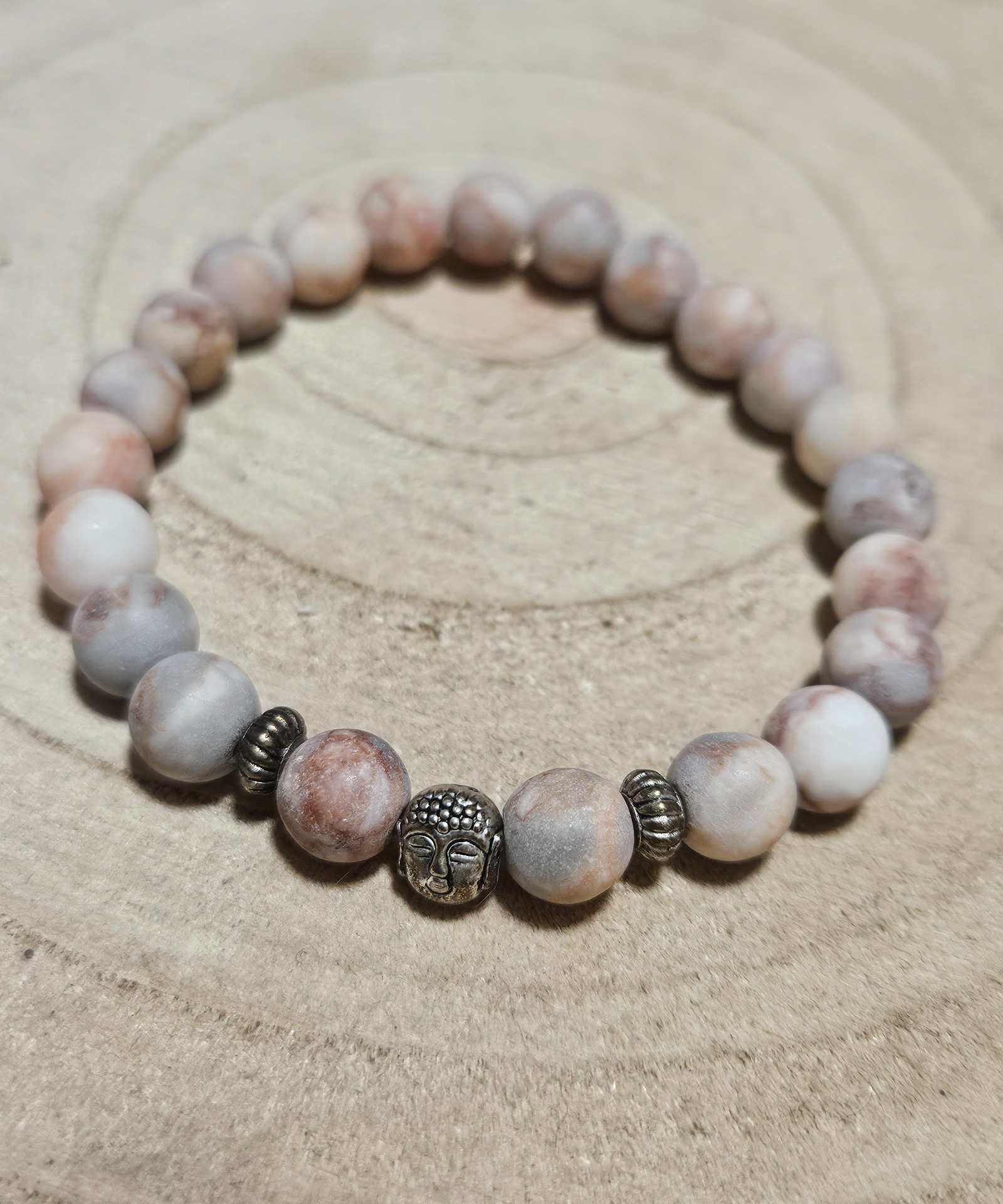 Tento náramok z jaspisu Netstone upúta svojím jemným, no pozoruhodným vzorom. Červenohnedé žilky na svetlom, krémovom podklade tvoria hustú sieť, ktorá symbolizuje ochranu a bezpečie. Tento náramok je vyrobený z 8 mm korálok a dvoch detailne spracovaných kovových ozdôb, navlečený na pružnej gumovej šnúrke, vďaka čomu je pohodlný na nosenie a poskytuje neustále upokojujúcu a podpornú energiu.
