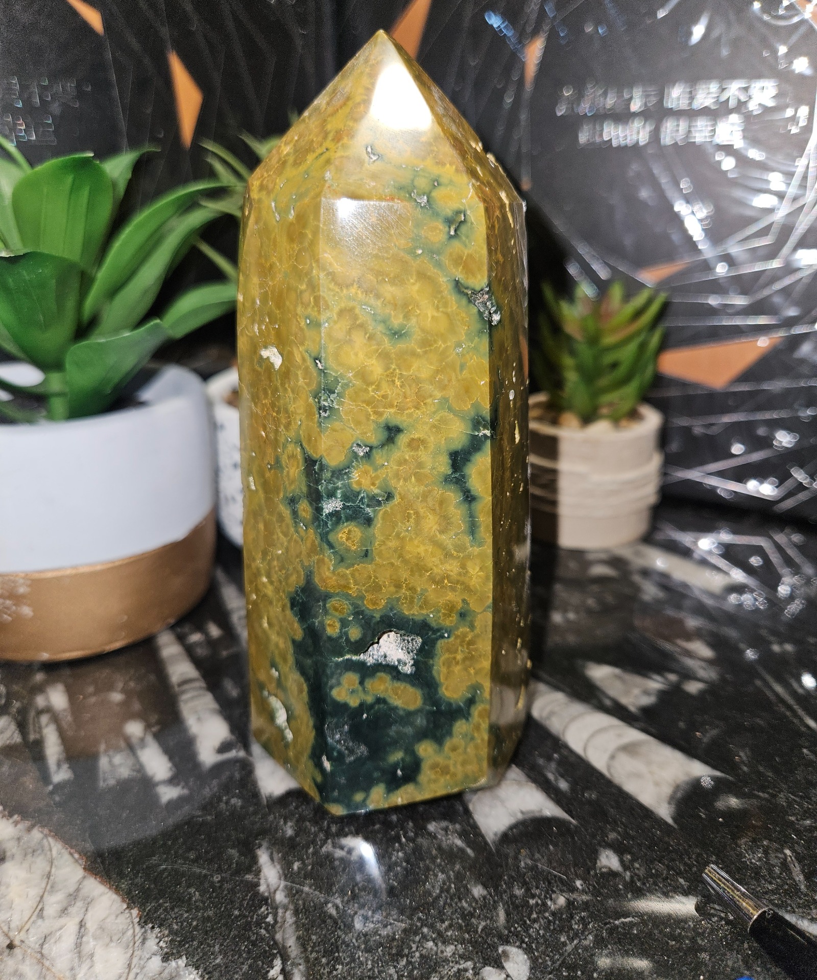 Tento nádherný, 14,5 cm vysoký a 592 g obelisk z oceánskeho jaspisu prináša pokoj a radosť hlbokého mora priamo do vášho domova. Jeho jedinečné, kruhové vzory pripomínajú vlniacu sa hladinu vody, zatiaľ čo tvar obelisku zosilňuje energiu kameňa a nasmeruje ju nahor. Vďaka svojim rozmerom a hmotnosti ide o stabilný a pôsobivý kúsok, ktorý môže byť ústredným bodom vášho duchovného priestoru.