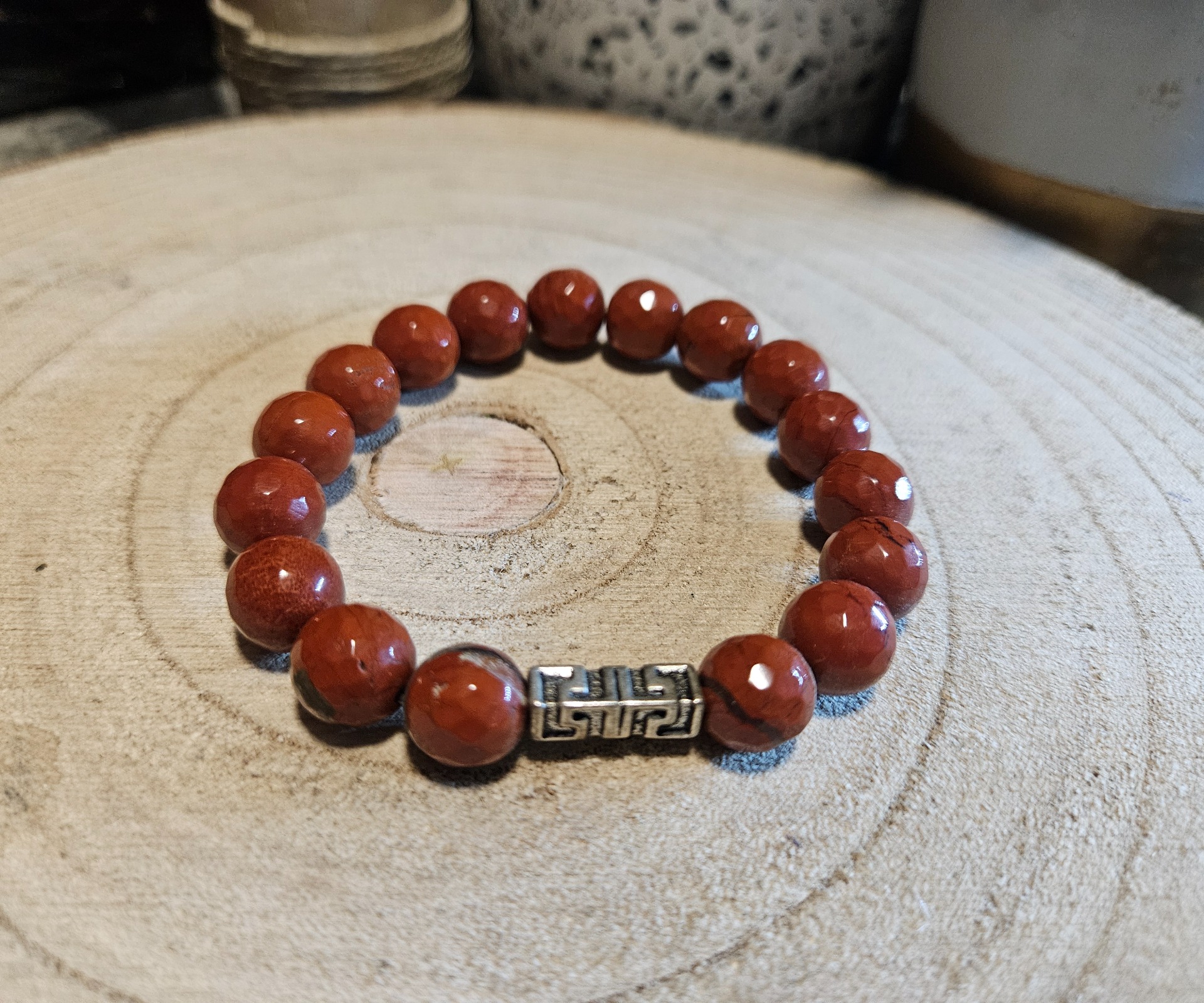 Tento elegantný fazetovaný náramok z 10 mm červeného jaspisu ponúka energiu kameňa v rafinovanej podobe. Leštené povrchy sa jemne lesknú pri každom pohybe, zatiaľ čo jedinečný kovový ozdobný prvok robí z náramku štýlový doplnok. Navlečený na pružnej gumovej šnúrke je pohodlný na nosenie a vyžaruje pocit bezpečia a elegancie.