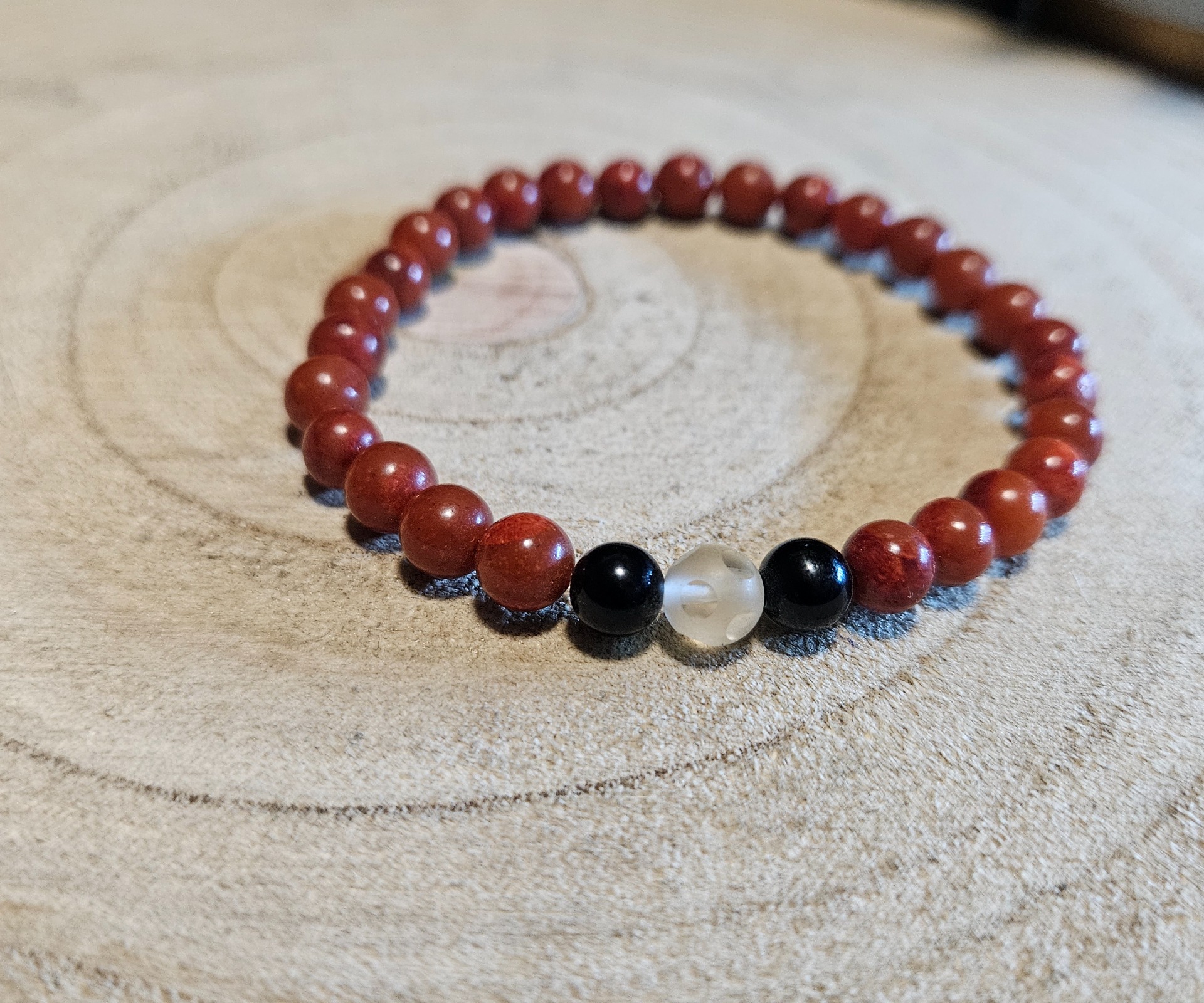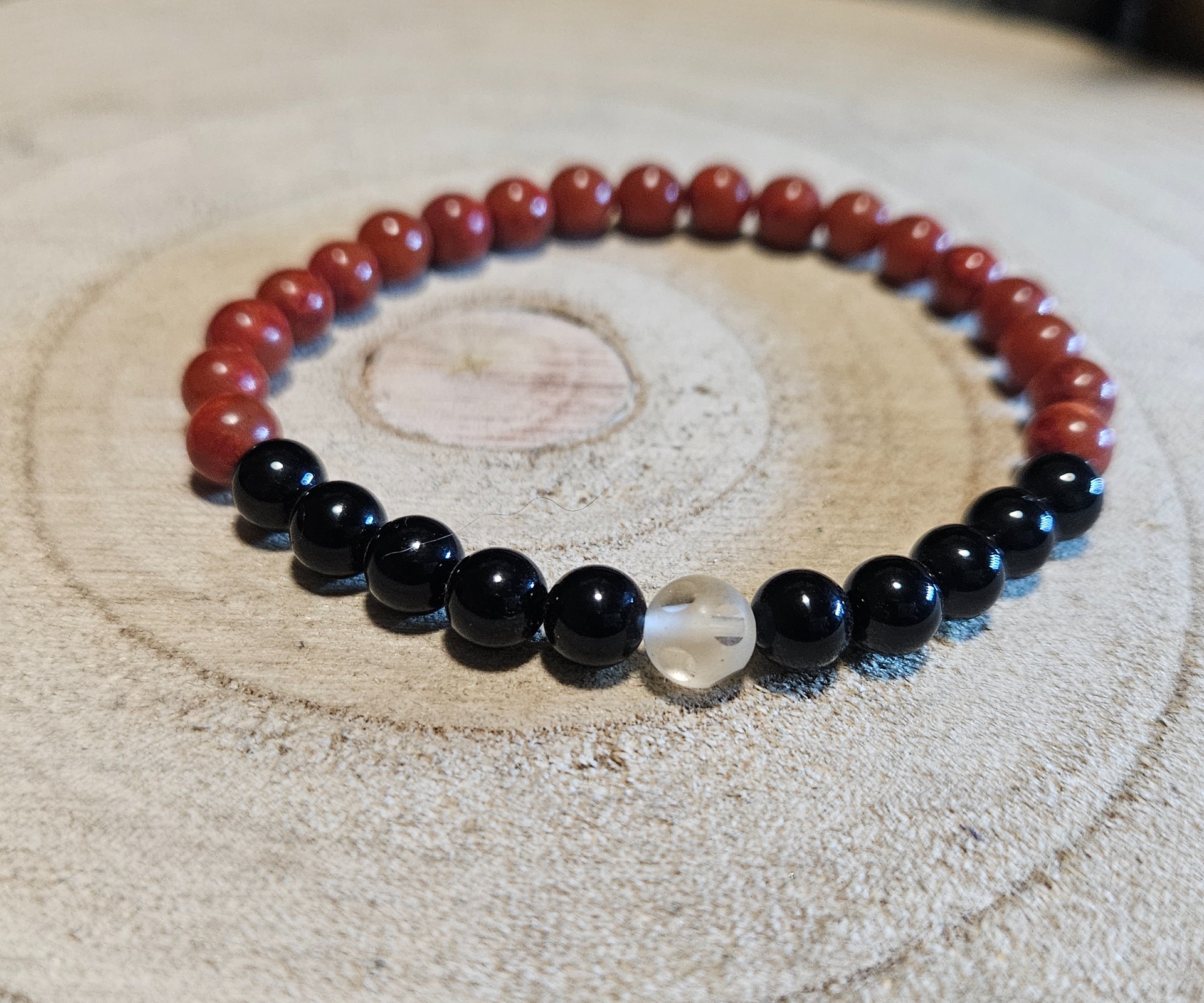 Tento náramok z 5 mm korálok spája trojitú silu červeného jaspisu, krištáľu a onyxu. Červený jaspis dodáva energiu a uzemnenie, ónyx poskytuje ochranu a disciplínu, zatiaľ čo krištáľ zosilňuje účinky všetkých kameňov a prináša jasnosť do myšlienok. Tento tenký a jemný náramok je nástrojom pre hlbšie zámery a duchovný rozvoj.