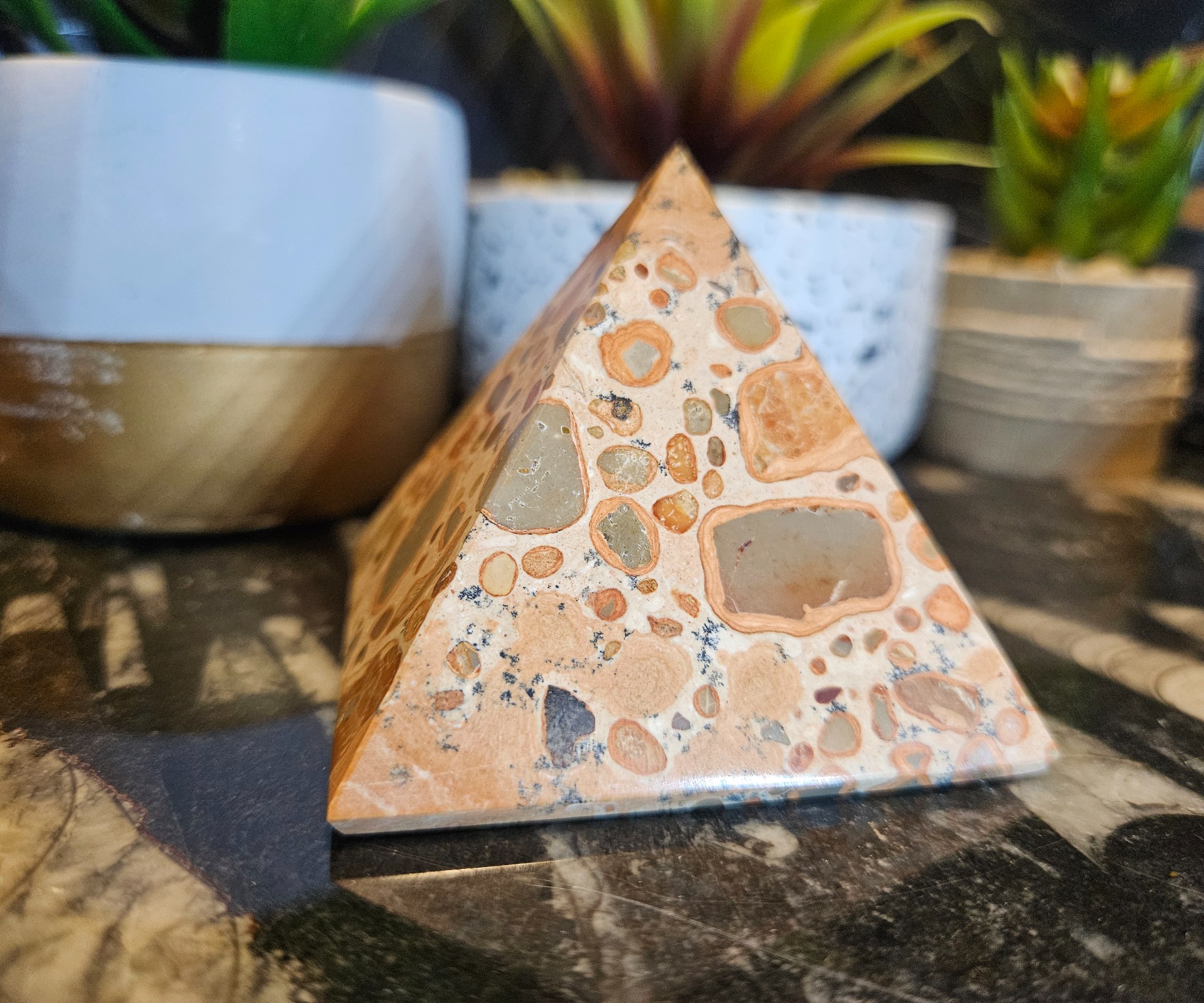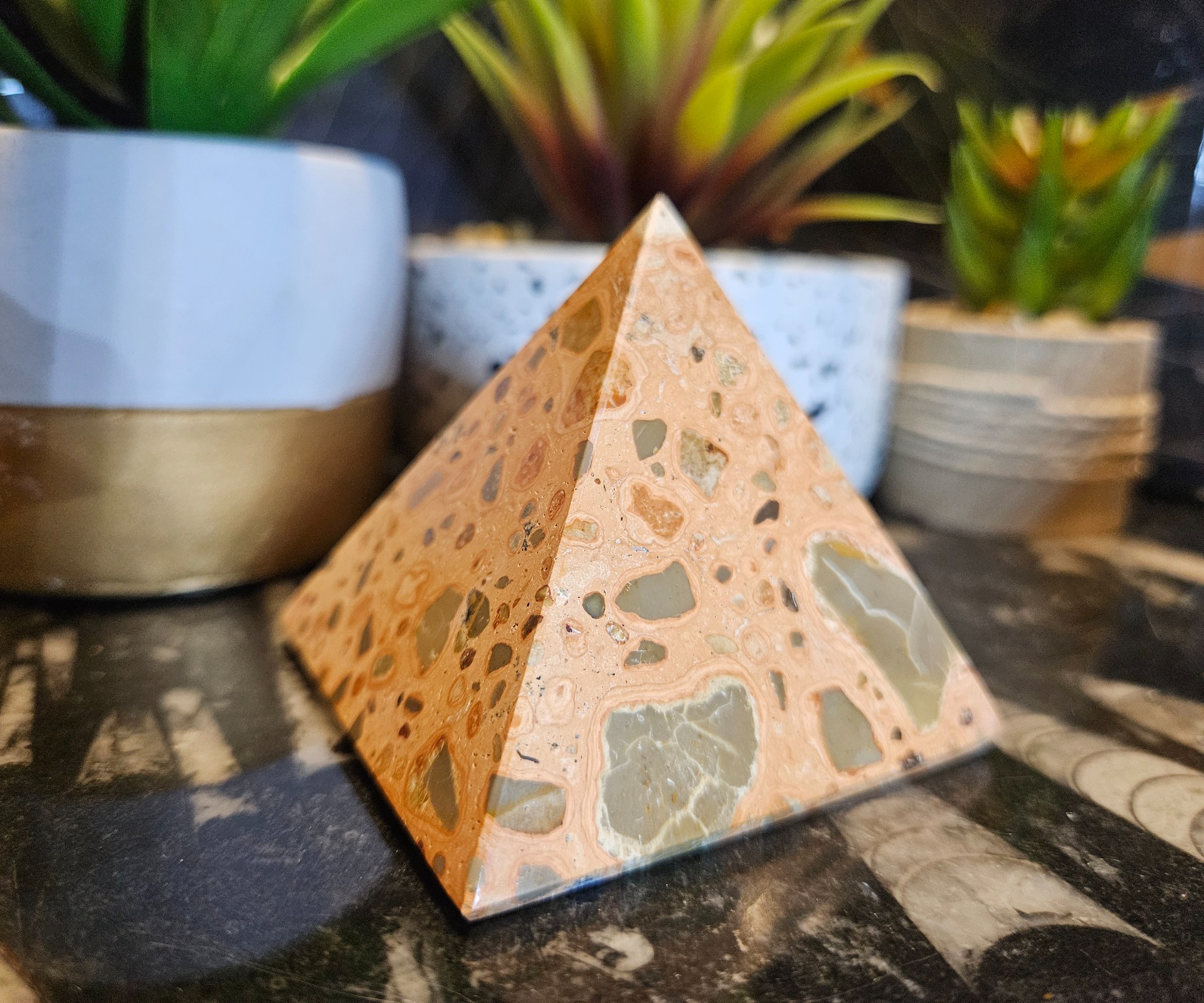 Táto krásna, 6x6 cm pyramída z leoparditu dostala svoje meno podľa jedinečného škvrnitého vzoru, ktorý symbolizuje silu divočiny a hlboké spojenie s prírodou. Tvar pyramídy nie je len estetický, ale je aj silným nástrojom na zber a zameranie energie. Keďže je každý kúsok vyrobený z prírodného kameňa, farby a vzory sa môžu líšiť a výber je náhodný, čo zaručuje, že získate jedinečný originál.
