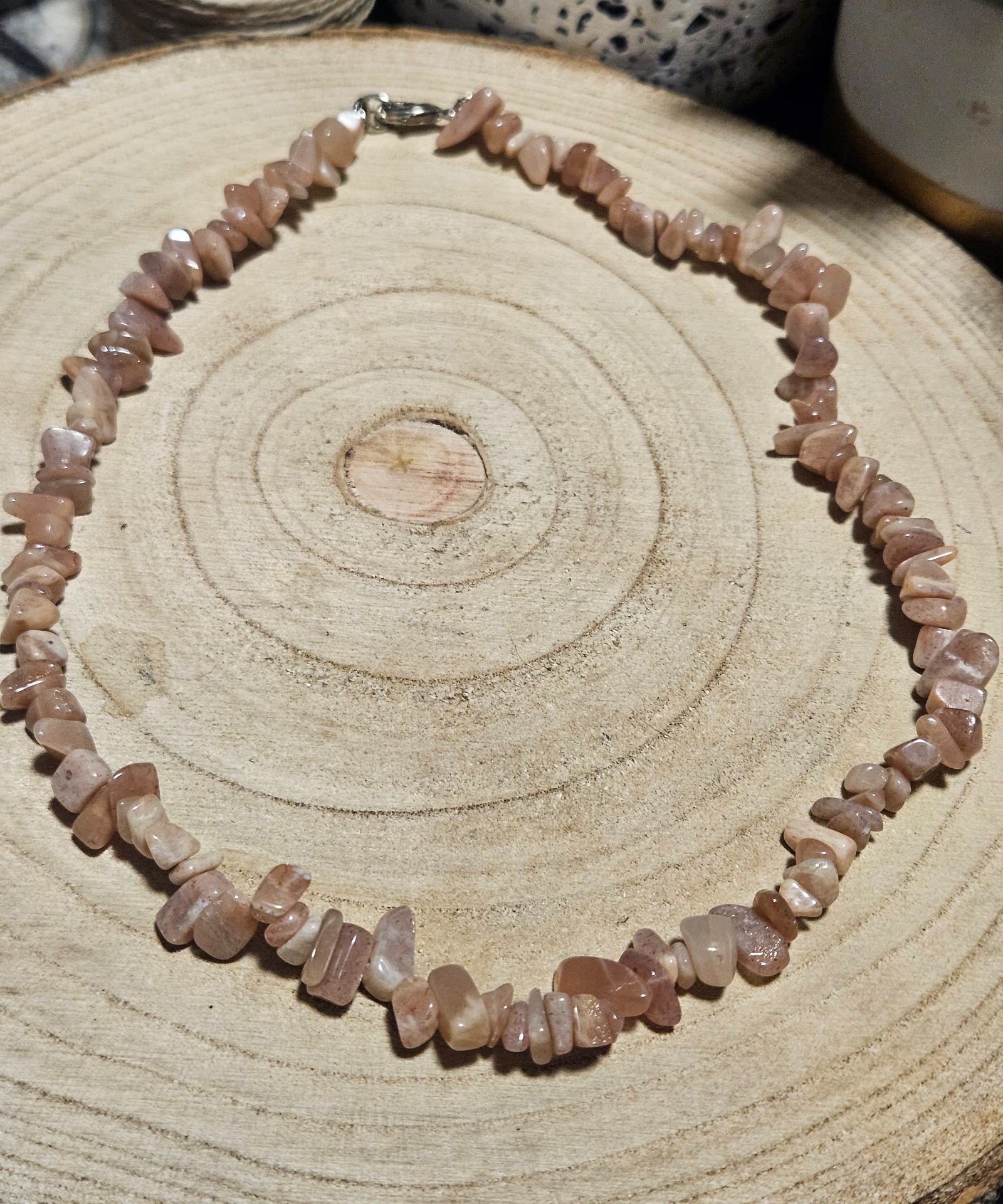 This elegant adularia moonstone necklace brings a soft play of light and natural beauty to your neckline. Each shard (splitter) is carefully selected to showcase the warm peach, cream, and soft brownish tones typical of this variety. The necklace has a very natural feel, and its length of 45-48 cm beautifully frames the neck. Adularia is known as a stone of emotional stability, calming the mind and supporting inner growth. It is an ideal accessory for women seeking to connect with their intuition and femininity in daily life. The practical clasp ensures secure and comfortable wear.