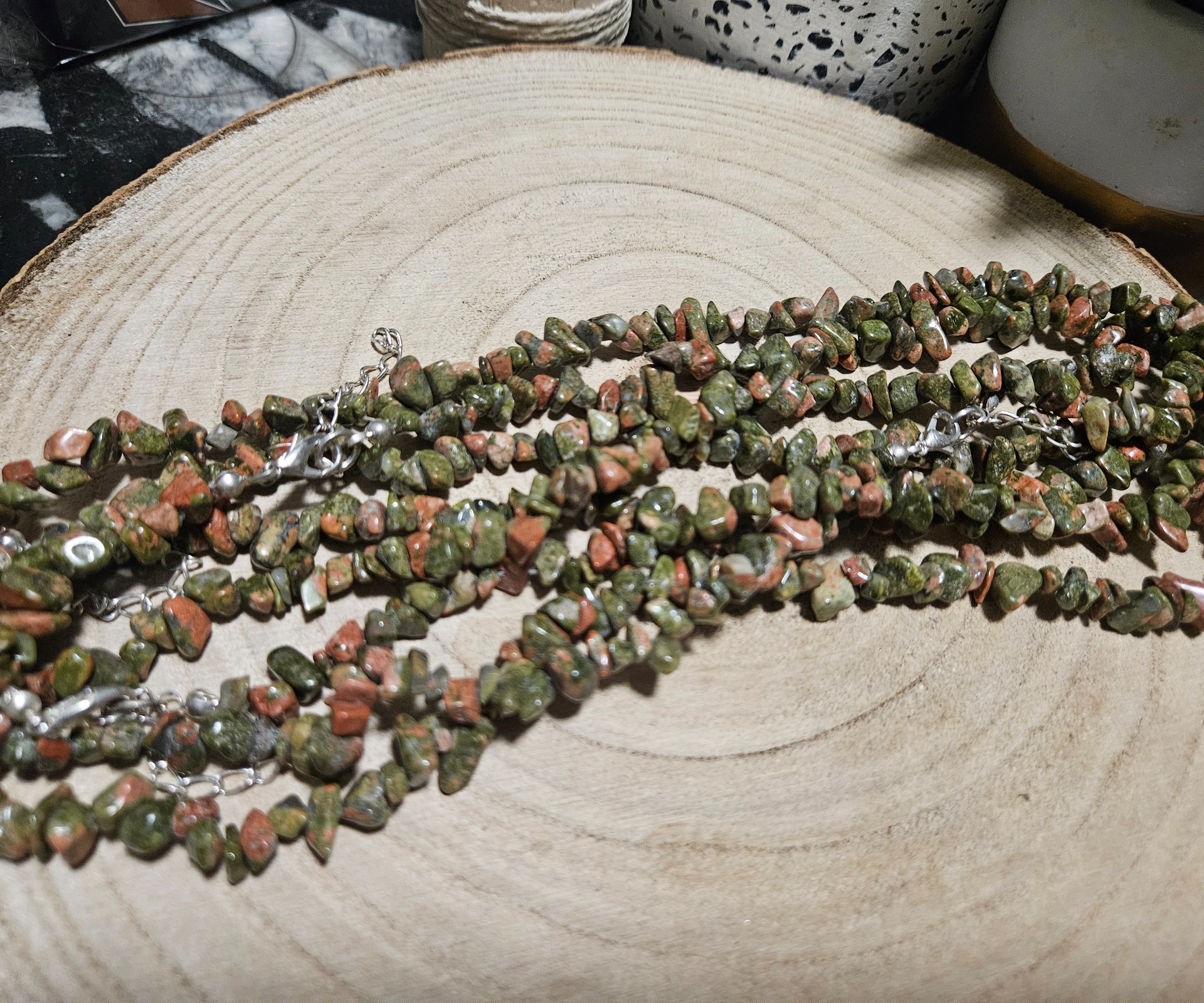 Tento Unakitový štiepkový náhrdelník nádherne spája prírodné odtiene zelenej (rast) a jemnej ružovej/lososovej (láska), vďaka čomu je ideálnym doplnkom pre tvoj každodenný život. Unakit, kameň rovnováhy, ti pomôže rozpustiť emocionálne bloky v Srdcovej Čakre a podporí ťa v procese uvoľnenia. Štiepkový tvar dodáva náhrdelníku jedinečnú, prírodnú textúru.