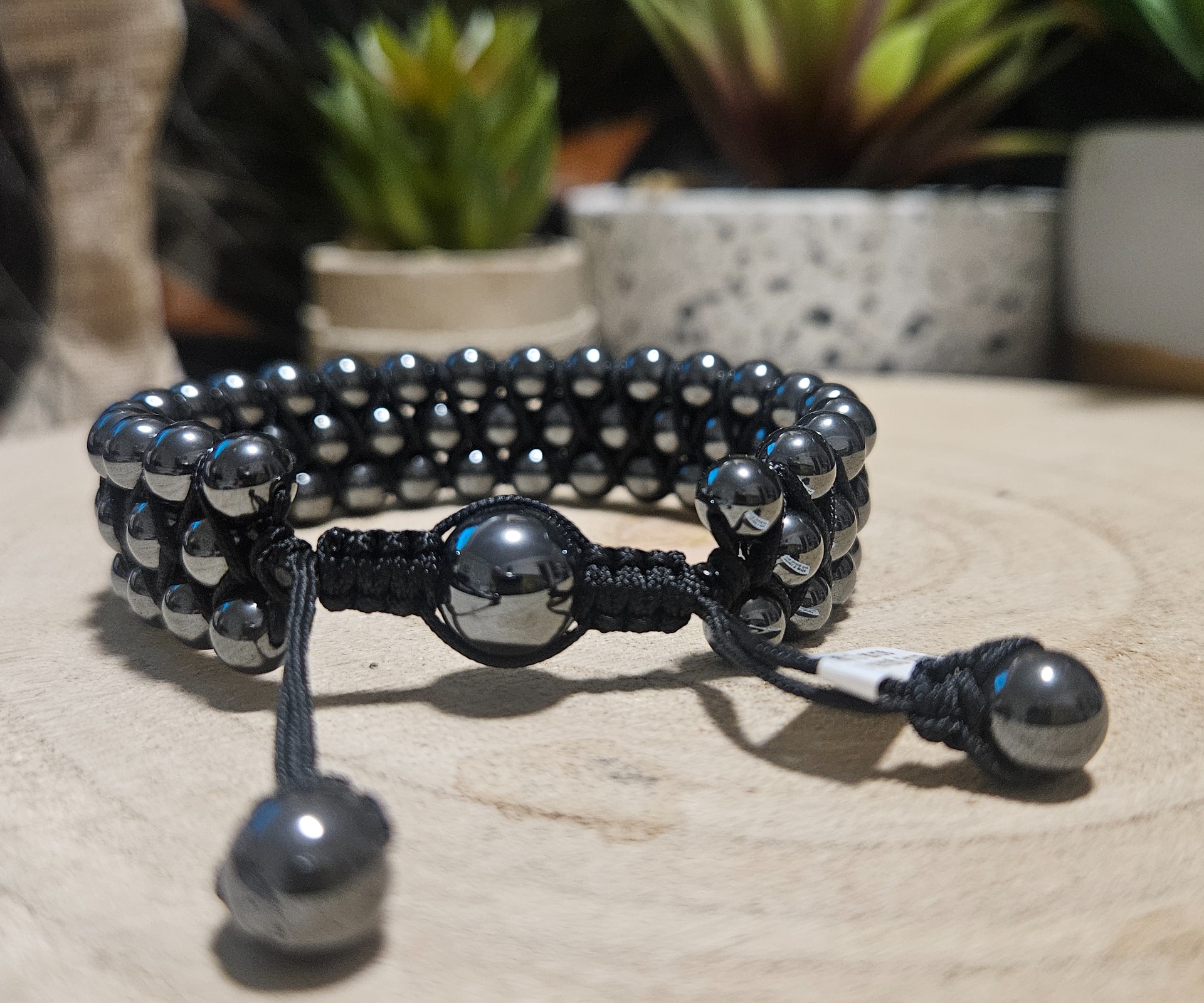 Jedinečnou charakteristikou náramku je jeho navliekanie na Šamballa štýl uzlíkovanej šnúrky. Táto technika umožňuje, aby bol náramok nastaviteľný vo veľkosti a zaisťuje pohodlné a stabilné uchytenie na zápästí. Šamballa je symbolom pokoja a vyrovnanosti, ktoré sú spárované so stabilizujúcou silou Hematitu. Pletený vzor okolo centrálnej korálky, ako aj Hematitové korálky na koncoch uzáveru, dotvárajú Šamballa dizajn.