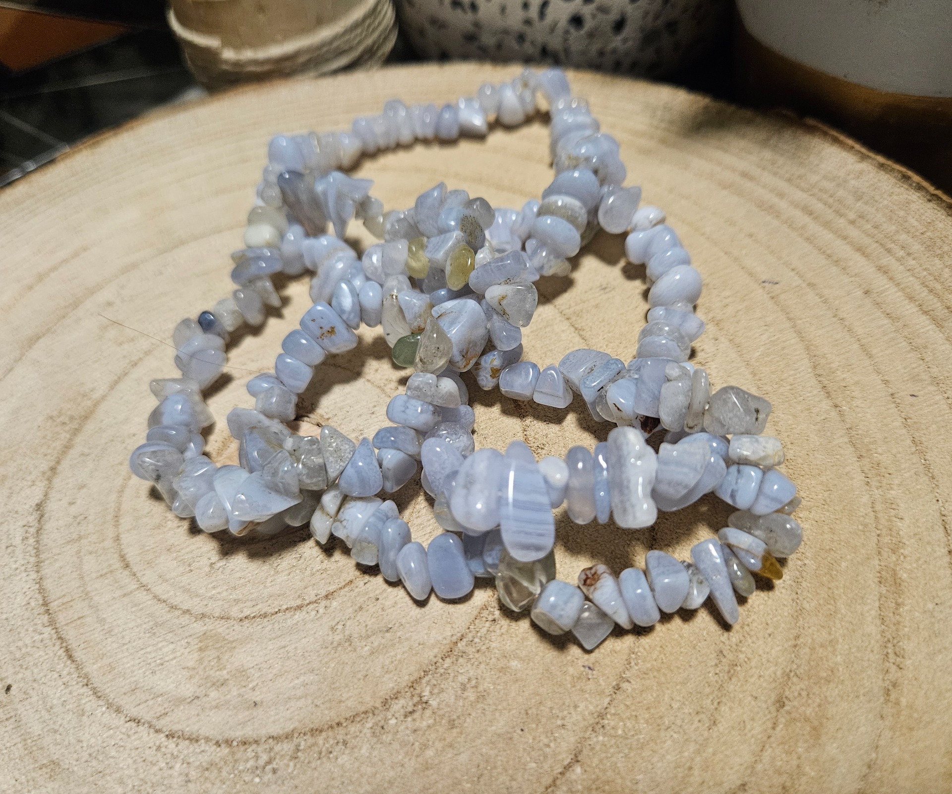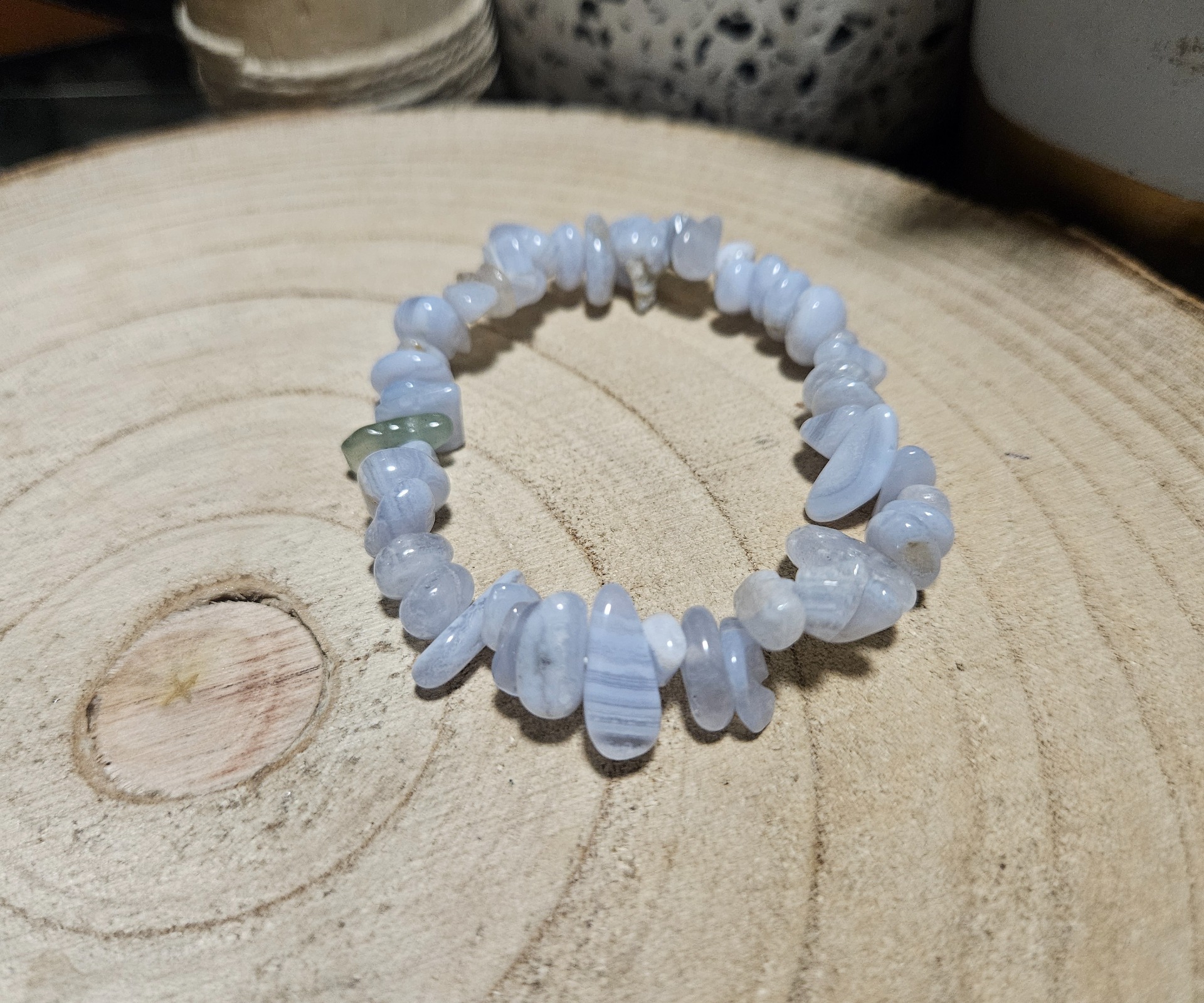 Noste tichú silu na svojom zápästí! Tento Náramok Modrý Chalcedón Štiepky je najjemnejšou energiou, ktorá vám pomôže skrotiť vaše úzkostné myšlienky a otvoriť kanály čistej komunikácie. Náramok je vyrobený z drvených, nepravidelných kúskov (štiepok) kameňa, čím zaisťuje priamy kontakt surovej, nefiltrovanej energie Chalcedónu s vašou pokožkou.