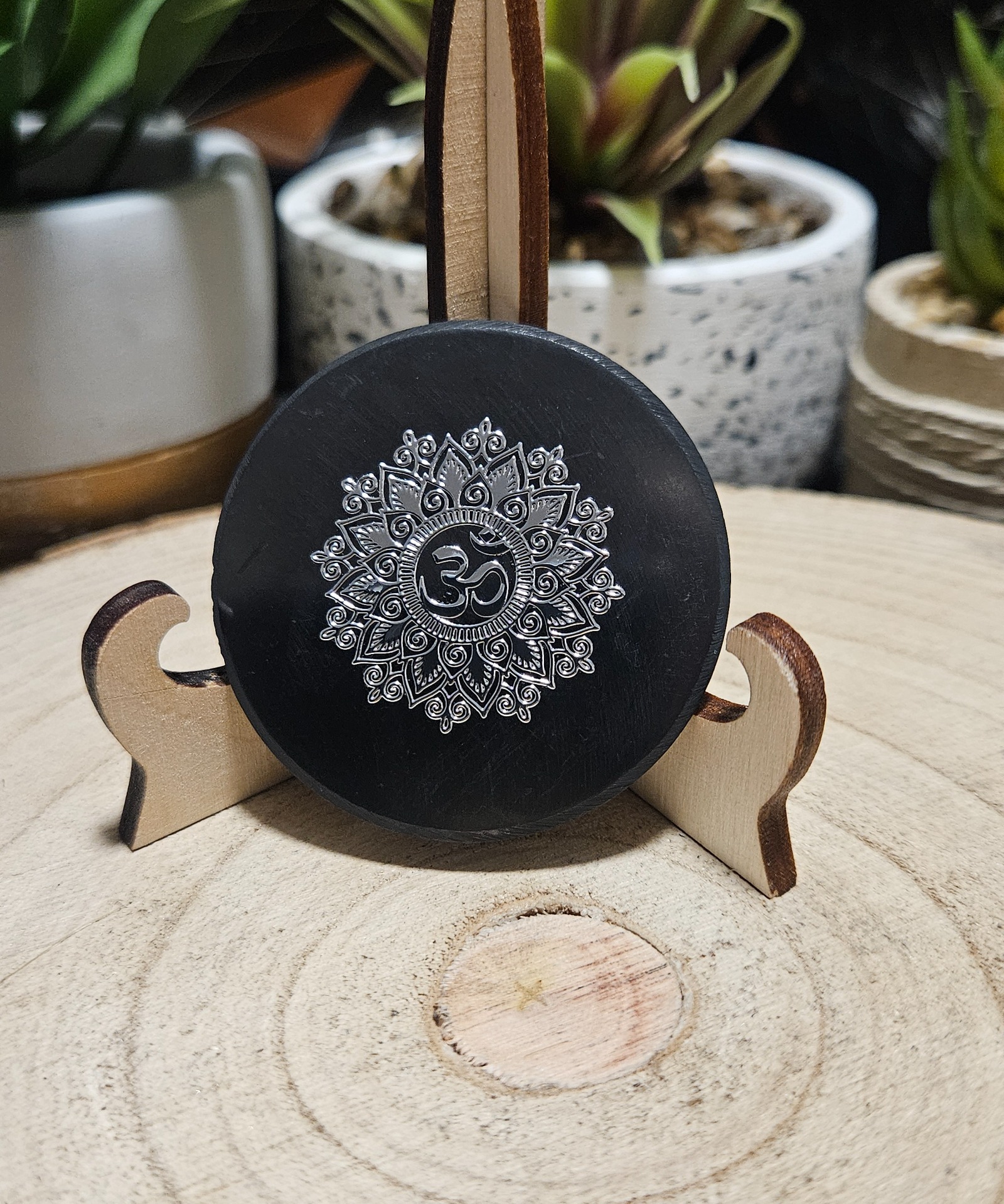 The silver mandala depicting the universe's first sound, Om, aids in meditation and finding inner silence. Shungite's deep black color and the mandala's delicate lines create a perfect balance. This disc acts as a shield against electrosmog while emitting a calming vibration. Each mineral is unique, and I will select it randomly for you.