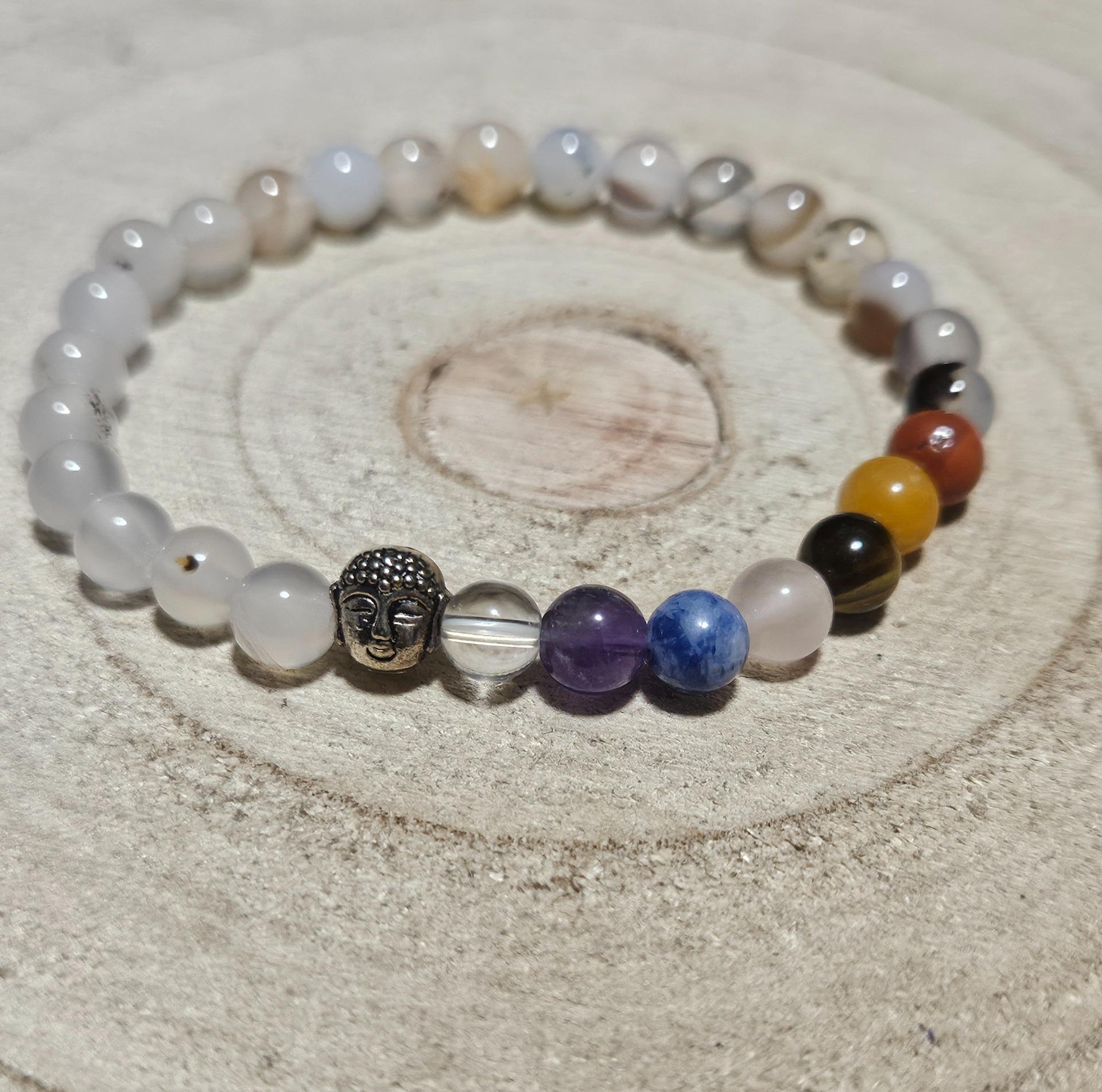 This delicate bracelet, made of 6mm beads, is your 7 Chakra Meditation Bracelet, and it's more than just an accessory—it's a daily reminder of your inner peace. The seven primary chakra minerals (including Red Jasper, Tiger's Eye, Amethyst, and Sodalite) are strung into fine, 6mm beads to harmonize your energy from the root to the crown.