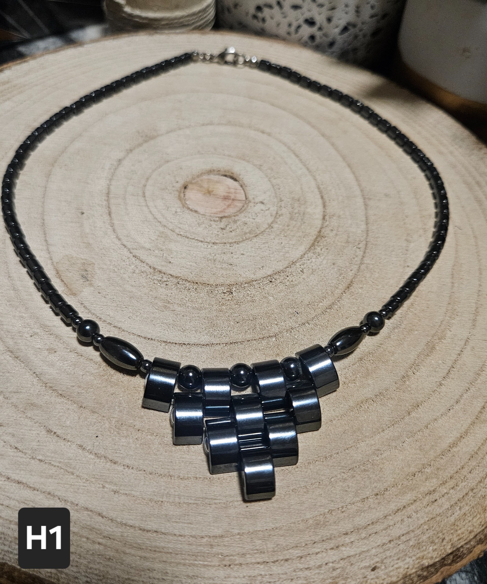 This modern inverted triangle Hematite pendant represents strength and stabilizing downward energies. The downward-pointing apex symbolizes grounding and a stable presence, while the natural metallic luster of the Hematite provides an elegant and determined look.