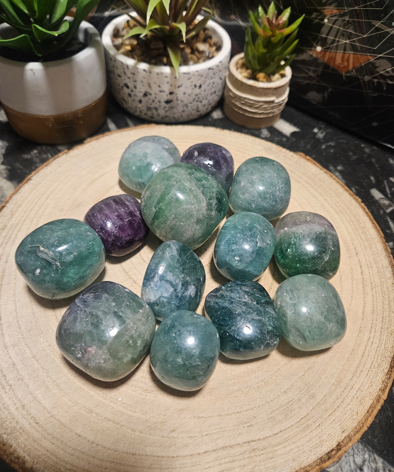 Ez a nagy méretű Fluorit dobcsiszolat a Fluorit gyönyörű, réteges színeit (lila, zöld, kék és átlátszó árnyalatok) mutatja be egy sima, polírozott formában. A 3–5 cm-es mérete miatt ideális arra, hogy a táskádban vagy a zsebedben hordozd, esetleg a tenyeredben tartsd meditáció alatt. Mivel minden darab egyedi mintázatú és színösszetételű, a rendelésedet véletlenszerű kiválasztás alapján küldjük ki.